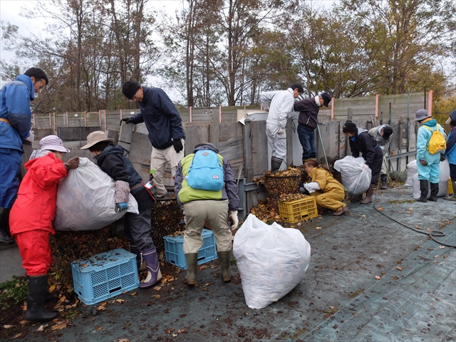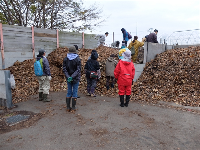 このたくさんの落ち葉は百合が原公園だけでなく大通公園からも運ばれてきます。園内の舗装路に落ちた葉をゴミとして排出するのではなく、ここで堆肥を作って再利用しているのです。