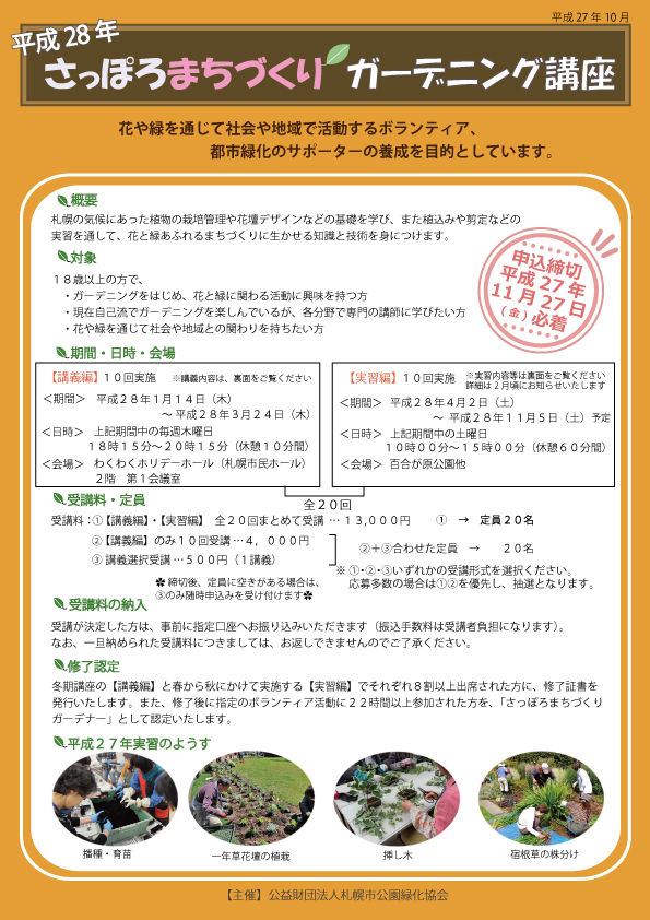 <11月27日(金)申し込み締め切りです!>平成28年さっぽろまちづくりガーデニング講座