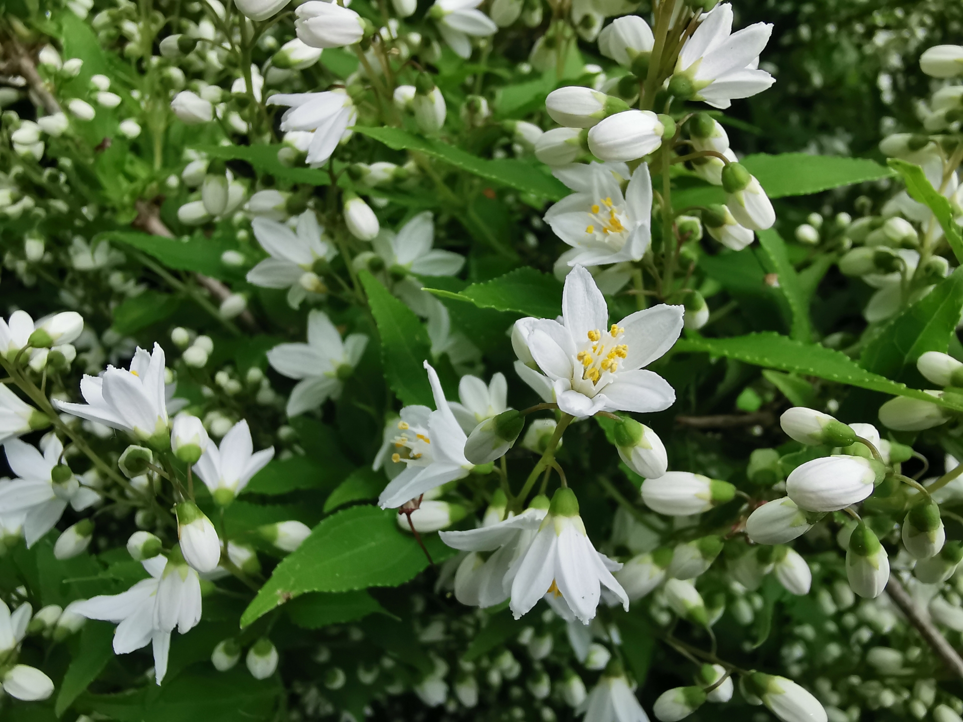 春になると、株いっぱいに真っ白な小さな花を咲かせるユキノシタ科の落葉低木です。小さな鈴なりの花がやさしく下向きに咲く姿が魅力的です。日本原産で寒さや暑さに強く、樹高は大きくなっても1m程度です。