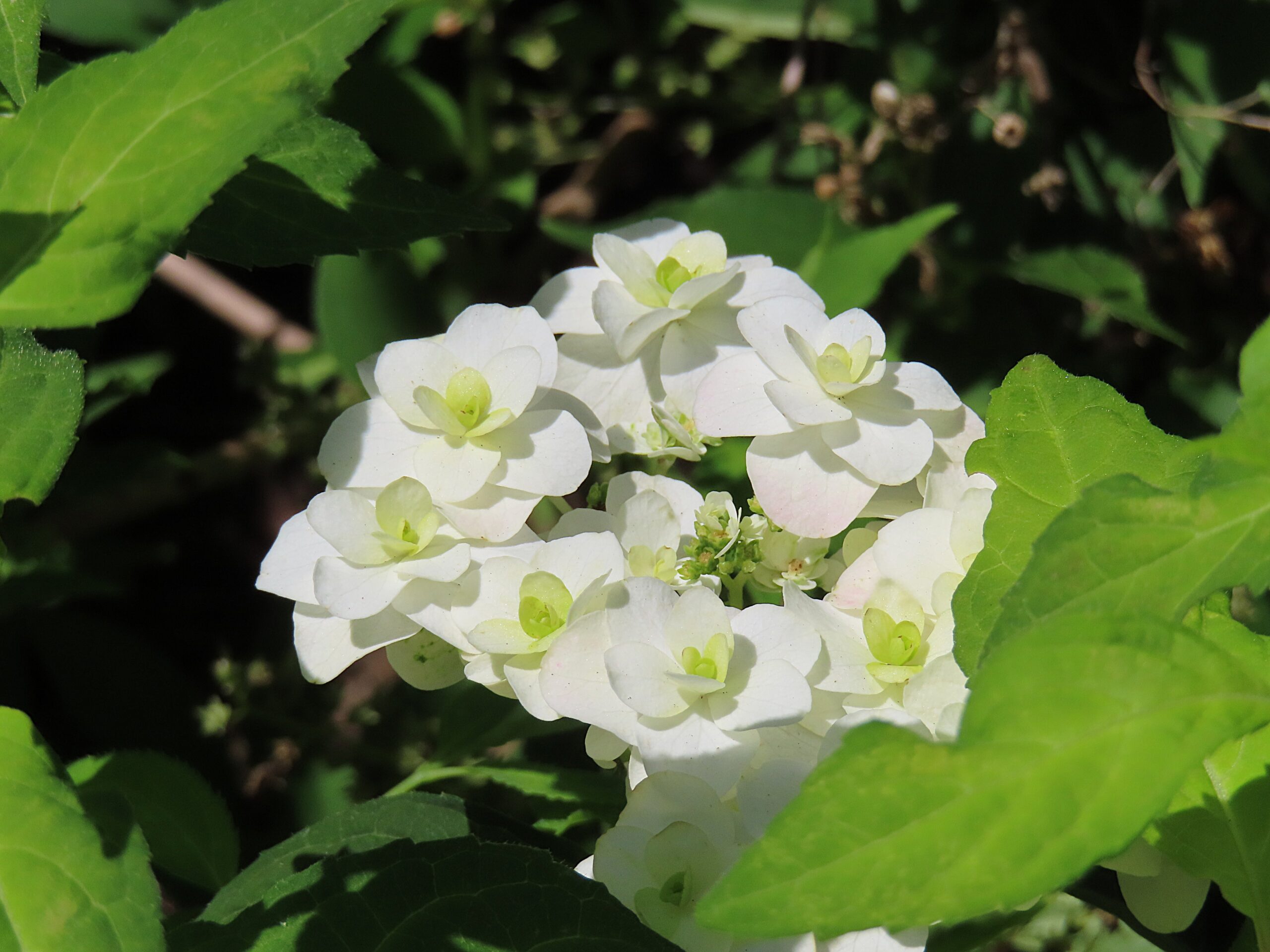 白い花八重咲き品種、清楚でやさしい雰囲気のヤマアジサイです。花つきがよく、滝のようにたくさんの花が楽しめます。