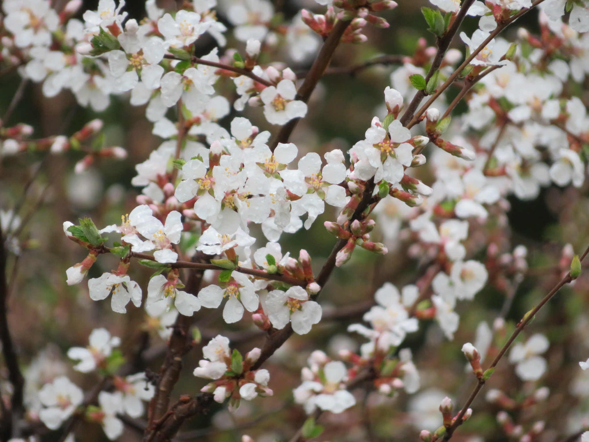 ユスラウメは、ウメに似た5弁の白~淡紅色の花を枝いっぱいに咲かせます。牧野富太郎博士によると、食用できる果実を収穫するのに木をゆするので、この名がつけられたのではないかといわれています。樹高は1.5~3m程度です。