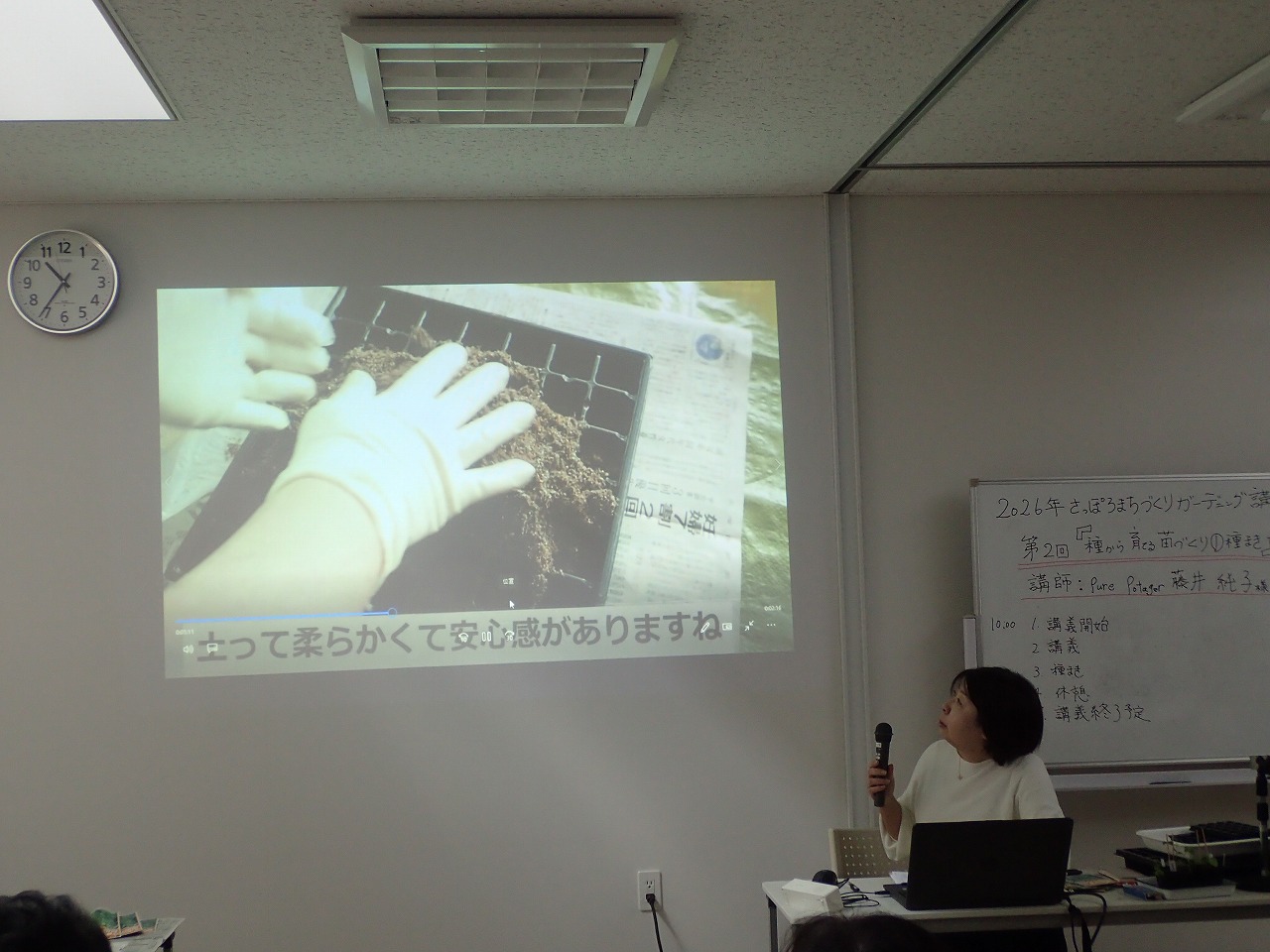 2026年4月18日土曜日、さっぽろまちづくりガーデニング講座、第2回目「種から育てる苗づくり1(種まき)」の講義と実習を豊平公園で行いました。講師は、ピュア・ポタジェ代表の藤井純子さんに務めていただきました。