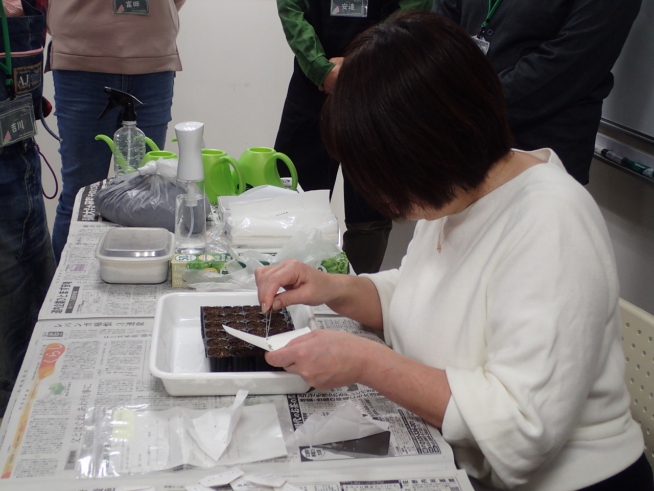 さあ、受講者の皆さんも各自、席にもどり種まき開始です!今回は、エンダイブ、スィートバジル、ホーリーバジル、マリーゴールド、ナスタチウム、イタリアンパセリ、風船かずら、ミニトマトの8種類の種を撒きました。ピンセットを使って元気に育ちそうな良い種を選びながら一粒ずつ丁寧に培養土の表面に置いていきます。
