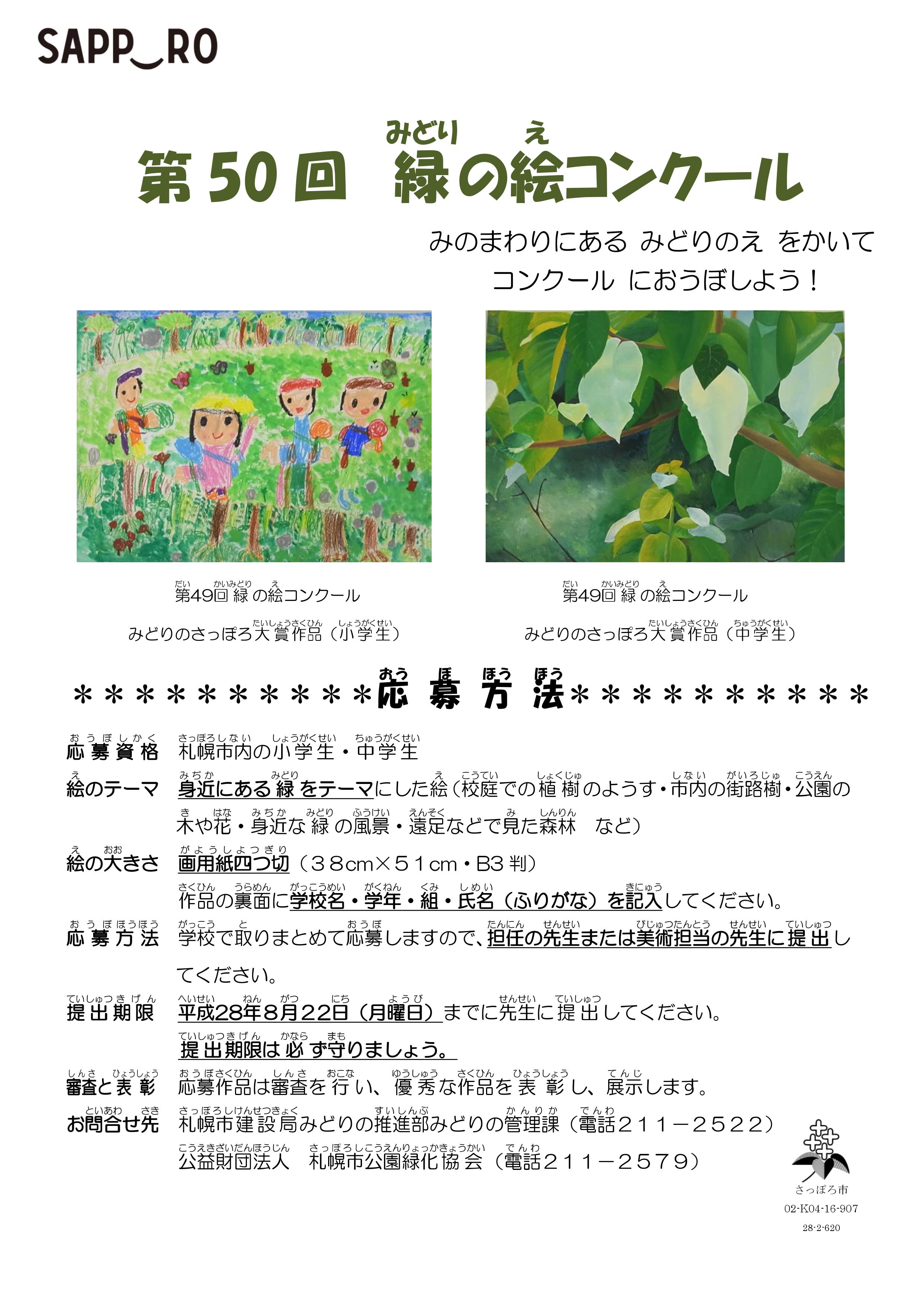 「緑の絵コンクール」は、身近な緑をテーマとすることにより、次代を担う子どもたちが「みどり」に親しみと興味を持ち、さらには理解を深めてもらうことを目的とした、札幌市内の小・中学生を対象とする絵画コンクールです。