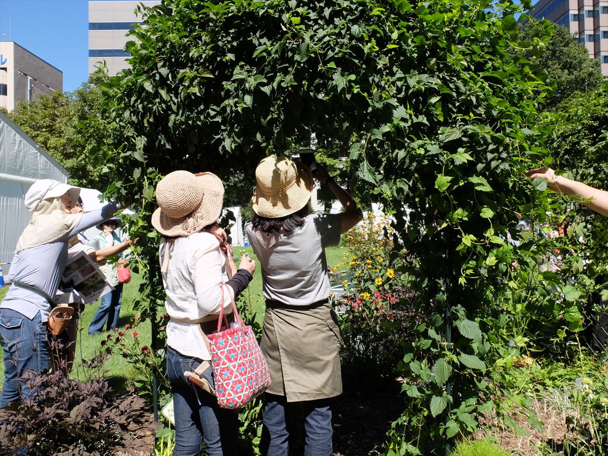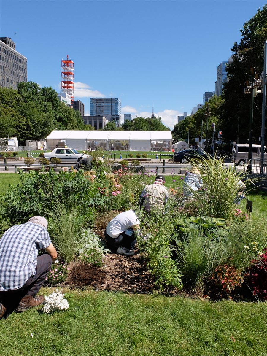実習の舞台となった8丁目の花壇は、札幌市と「さっぽろまちづくりパートナー協定」を締結しているサッポロビール株式会社から、花苗やホップ、資材の提供をうけ、ガーデニングリラの会大通班が花壇のデザインや苗の植えこみ、手入れや補植、秋の片づけまで花壇管理を一貫しておこなっています。