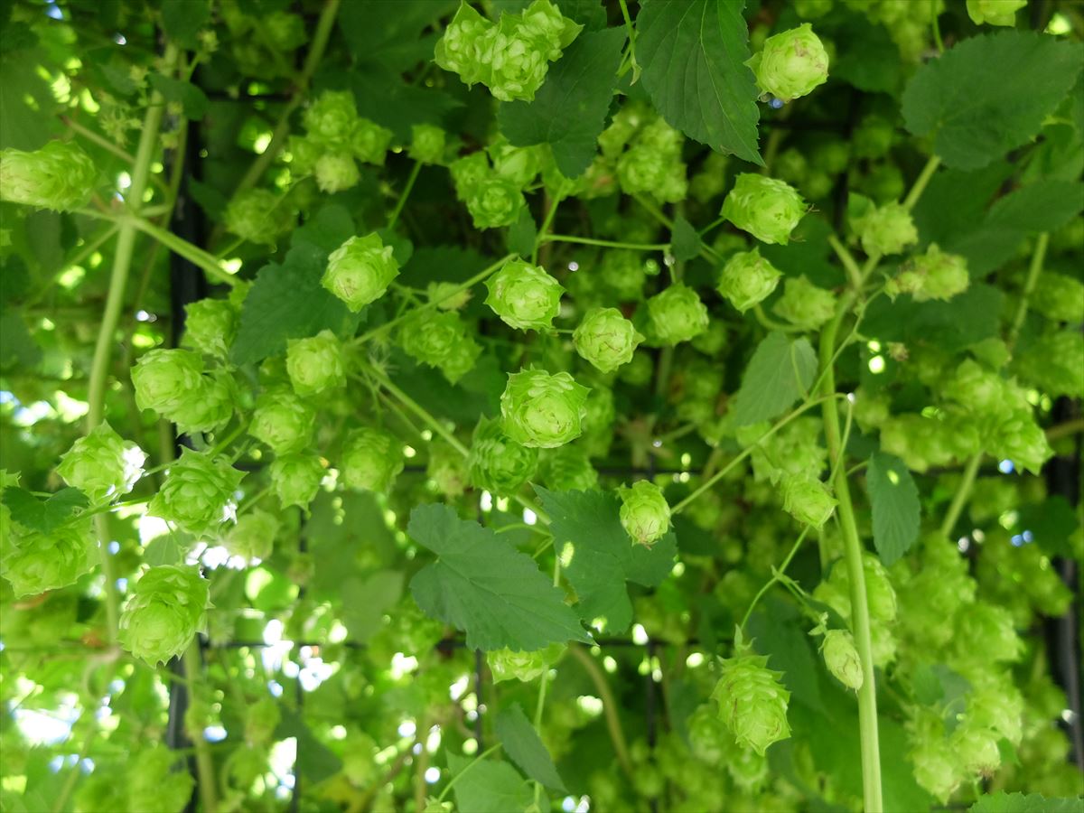 ホップの小径には、ホップの球果がたわわに実っています。なかなか見る機会がないのでみんなで観察しています。