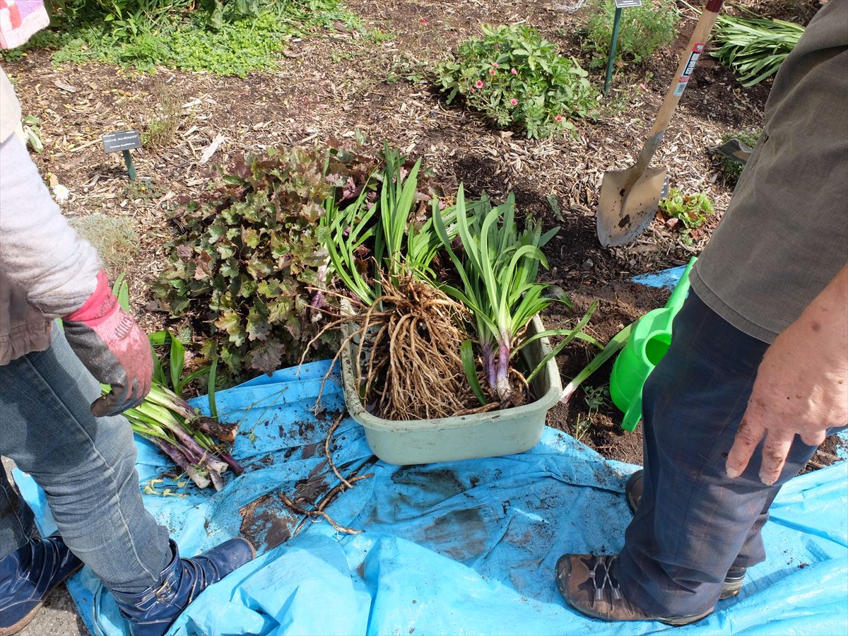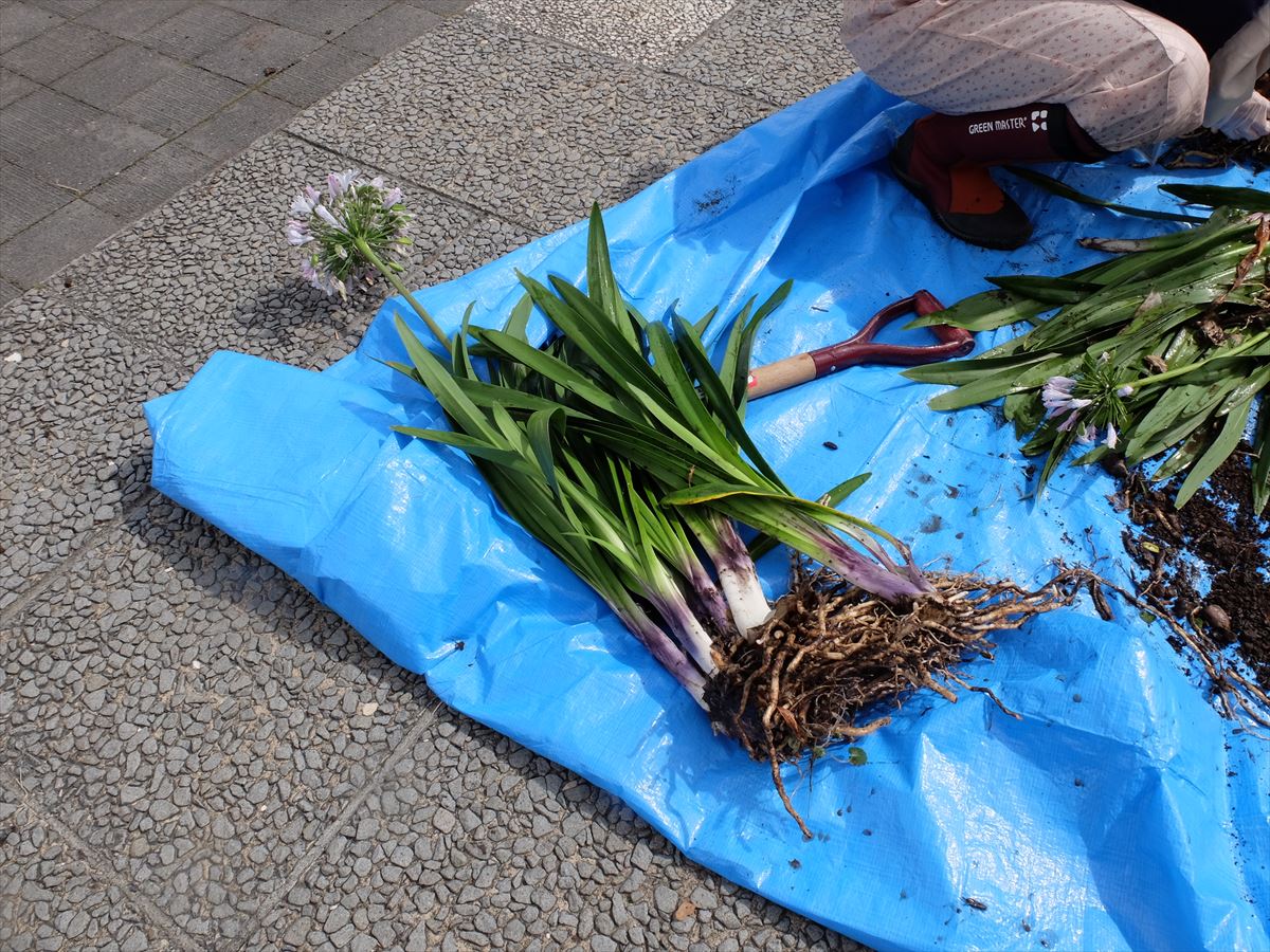 公園入口からリリートレイン駅舎に続く通路に面した花木園ボーダーで、アガパンサス、アカンサス モリス、ヘリアンツスの株分けを行いました。