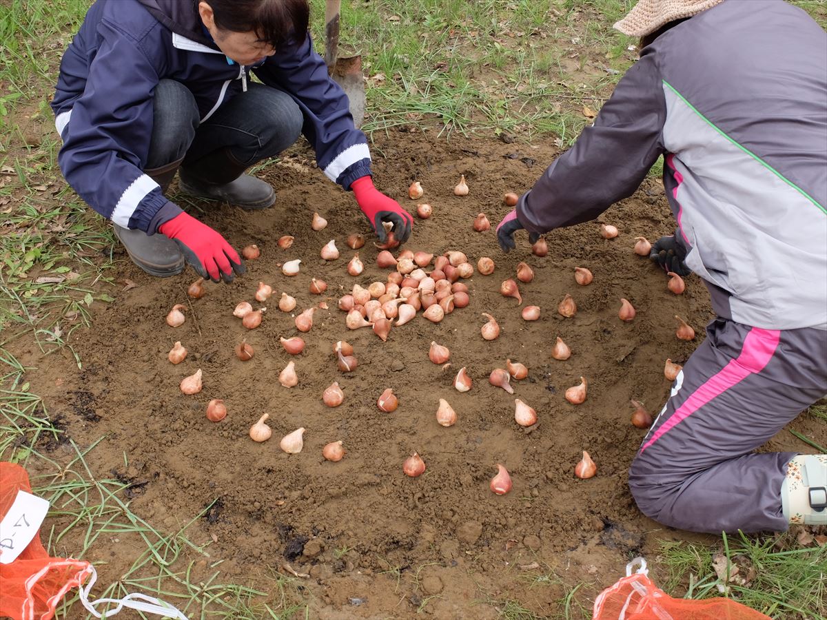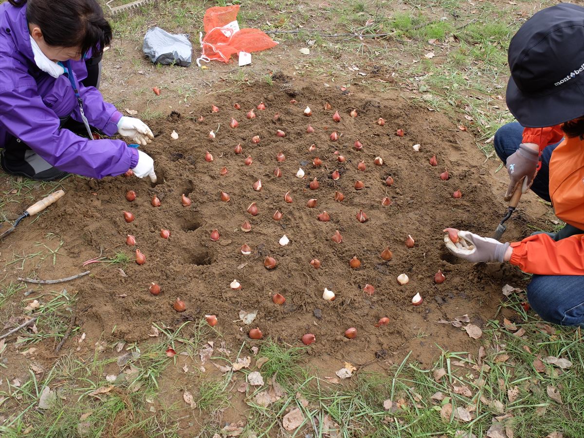 自分たちの植えた球根が、来春美しい花をつけてくれるように、植穴の深さや球根の向きに気を付けながらひとつひとつ植え込みます。