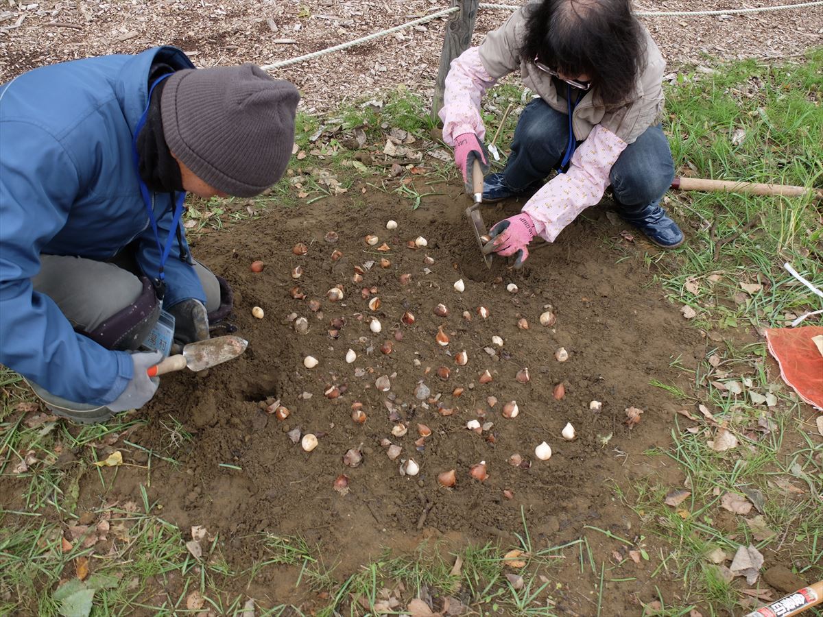 テーマは「球根類の管理」、百合が原公園内の「ムスカリの道」でチューリップ球根の植込みをおこないました。