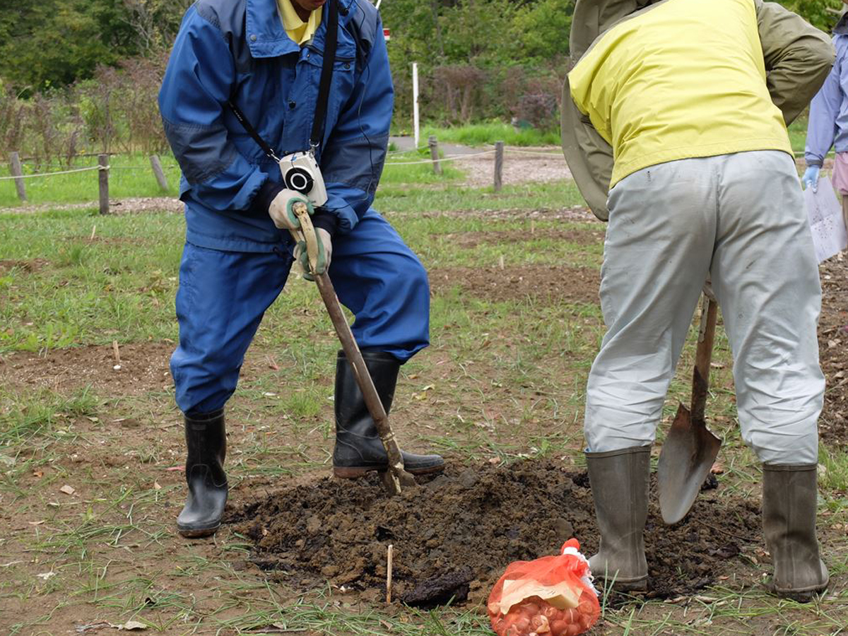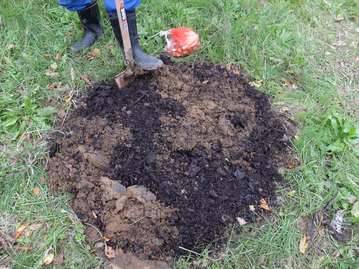 堆肥をたっぷり入れて土の上下を返し、混ぜ込みます。気温が低く肌寒くても、この作業をおこなうと体がぽかぽかあたたまります。