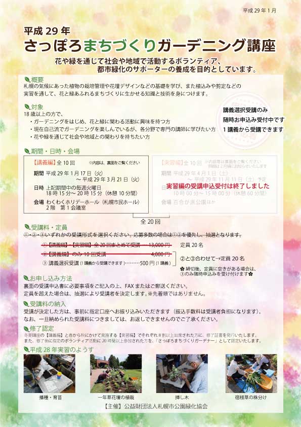 平成29年さっぽろまちづくりガーデニング講座【講義編】の講師が変更となりましたので、お知らせいたします。