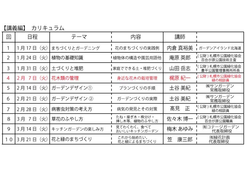 第4回「花木類の管理」の講師は、公益財団法人札幌市公園緑化協会の鮫島宗俊を予定していましたが、講師の都合により、同協会緑の相談員梶原紀一に変更となりましたので、ご了承ください。