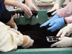 第一回目は㈲コテージガーデンの梅木あゆみさんをお迎えして「播種・育苗」の実習をおこないました。