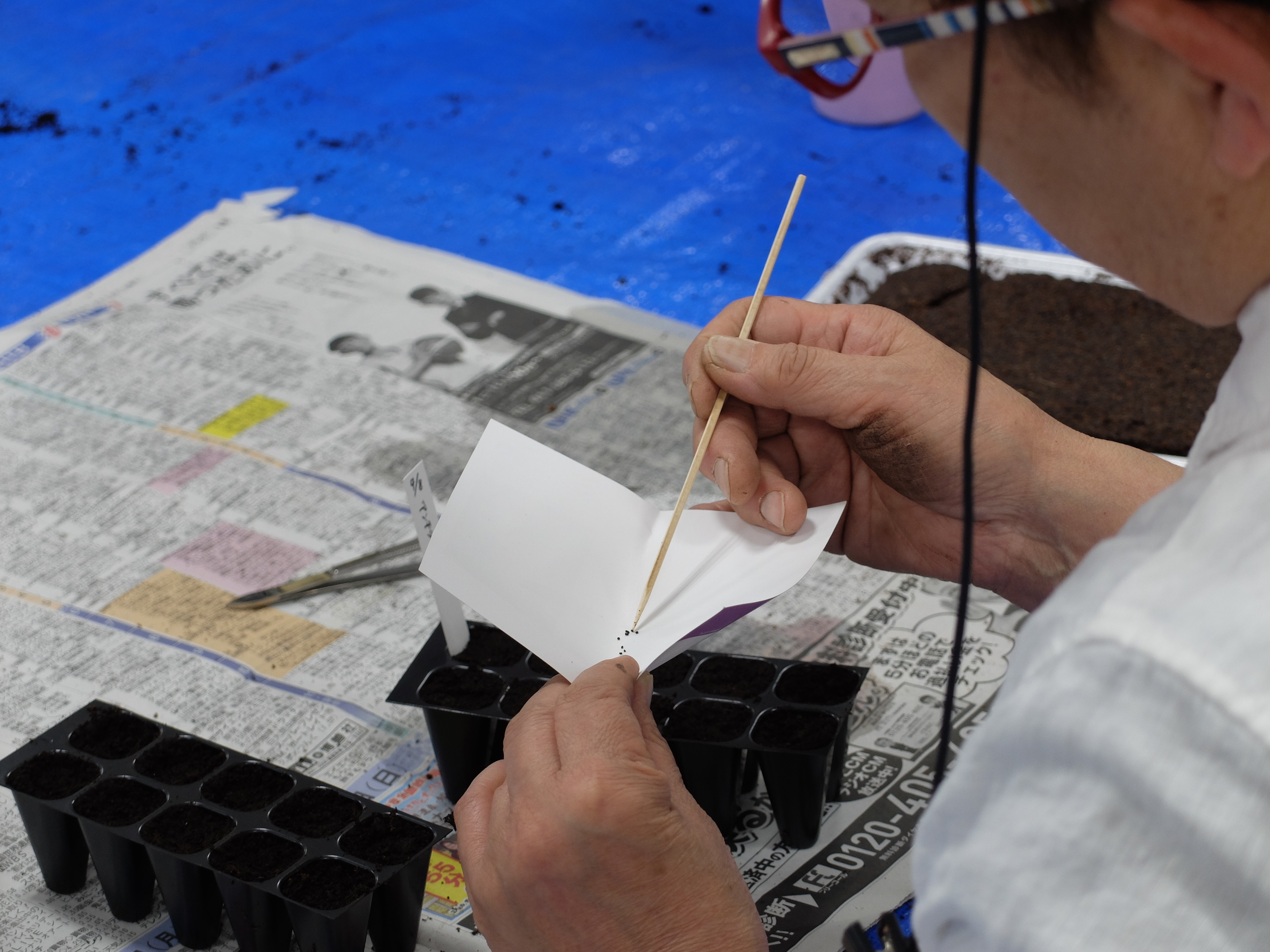 小さなタネもきちんと一粒一粒セルに蒔いていきます。