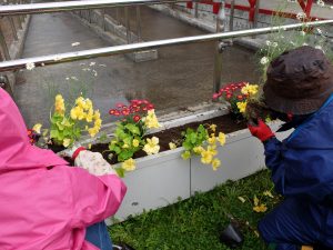 リリートレイン前の花壇とウイスキー樽を使用したコンテナ花壇の植え込み実習をしました。