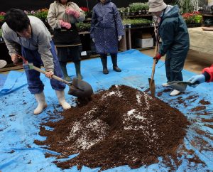 土と肥料を混ぜ合わせ、樽に詰めていくのですがここで一工夫!