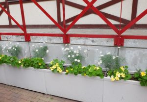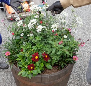 ガーデニング講座の実習第2回、第3回で植えたコンテナ花壇と一年草花壇で