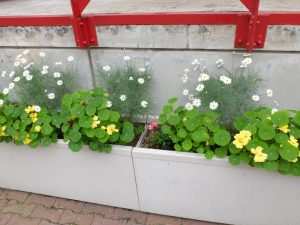 マーガレット側に伸びているナスタチウムは葉を切り、その他については花壇の前にたらすようにしました。