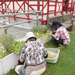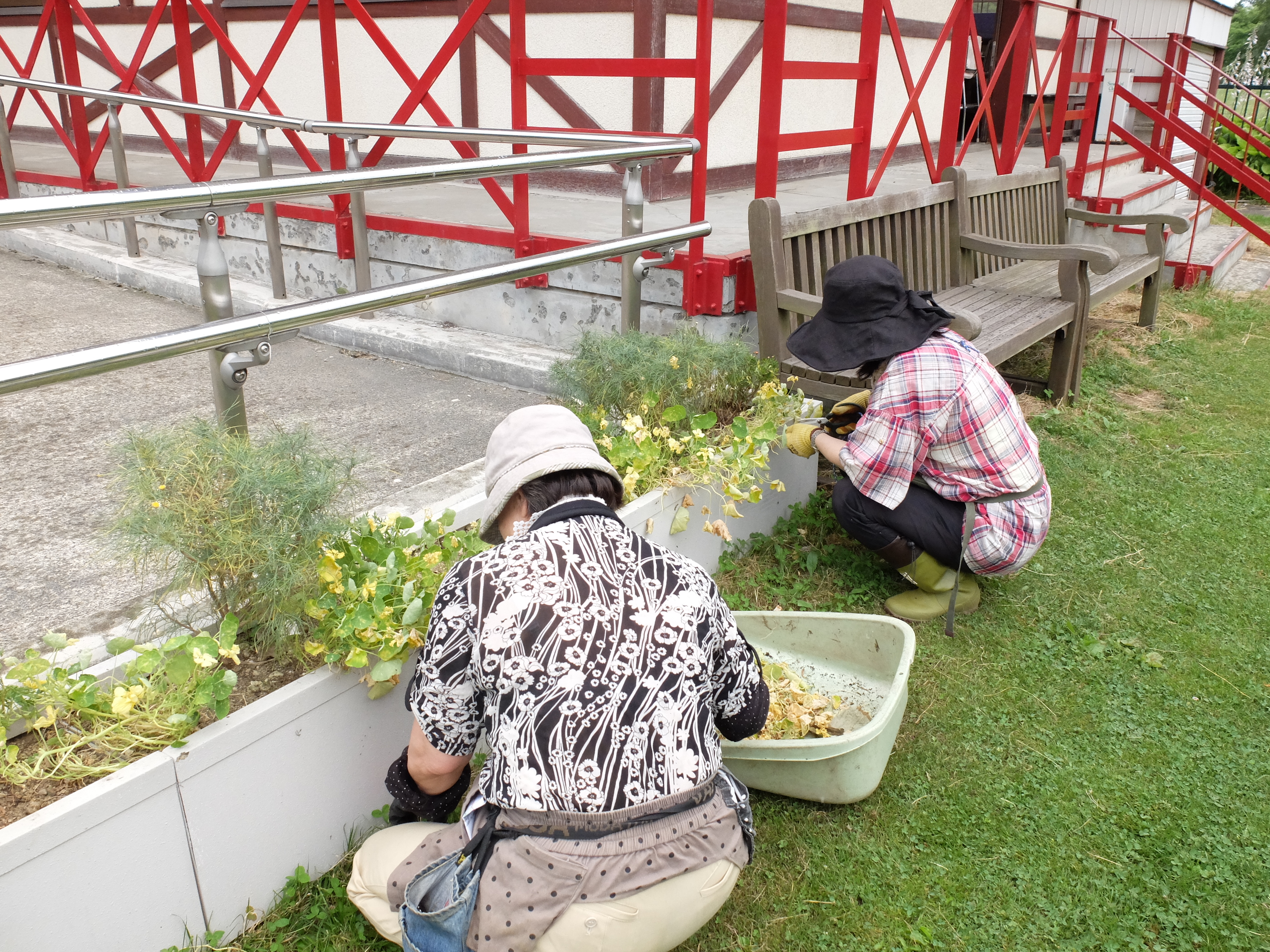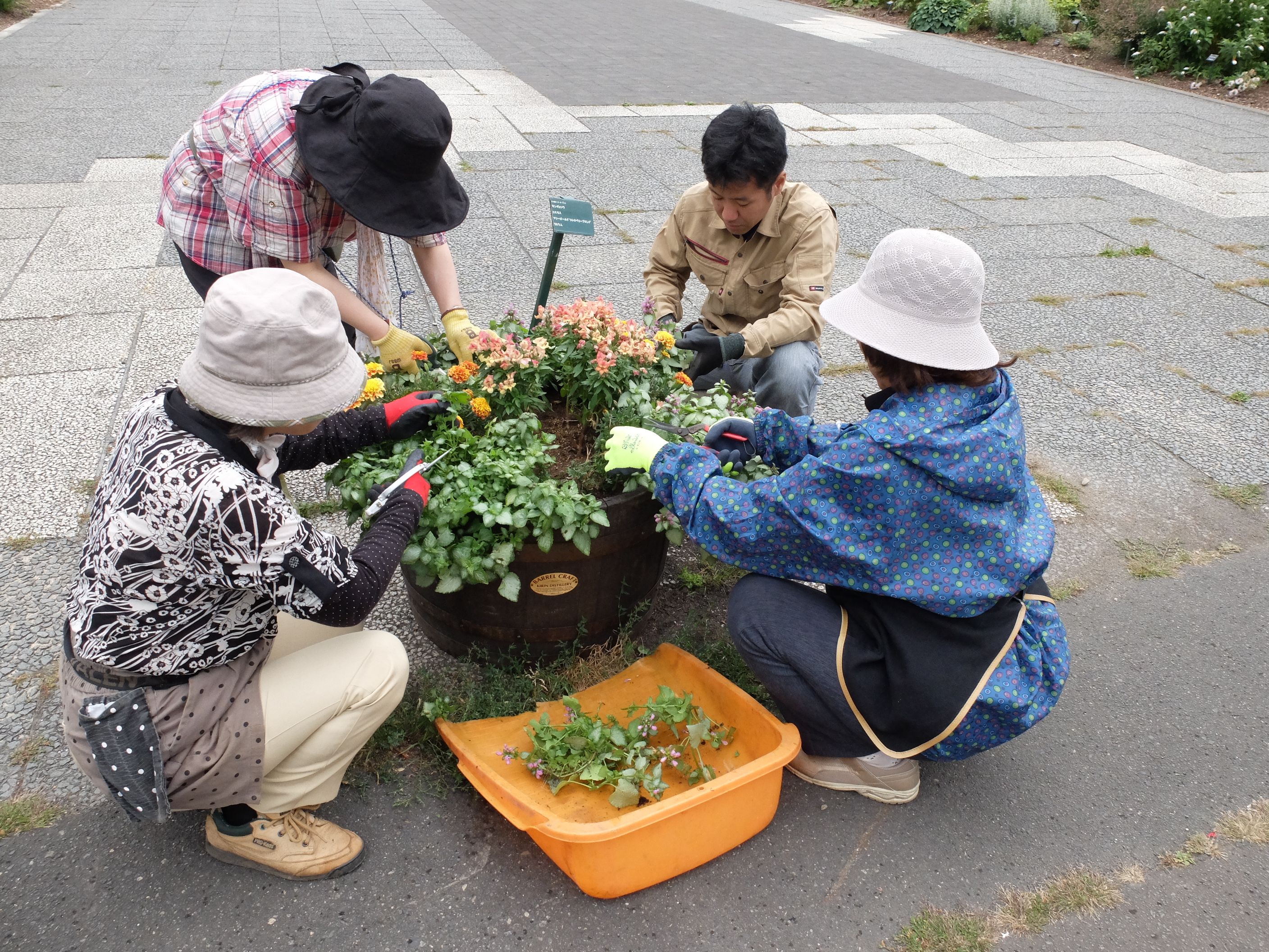 4名の受講者さんと、受講者さんのお子様でガーデニング講座の第2回、第3回で植えた花壇のメンテナンスを行いました。