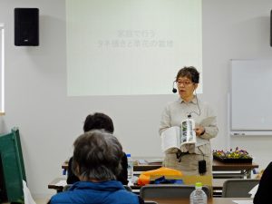 午前中は一年草、宿根草、多年草の分類、タネの保管方法や蒔き時期などについて資料を交えながら座学形式で講義を行っていただきました。