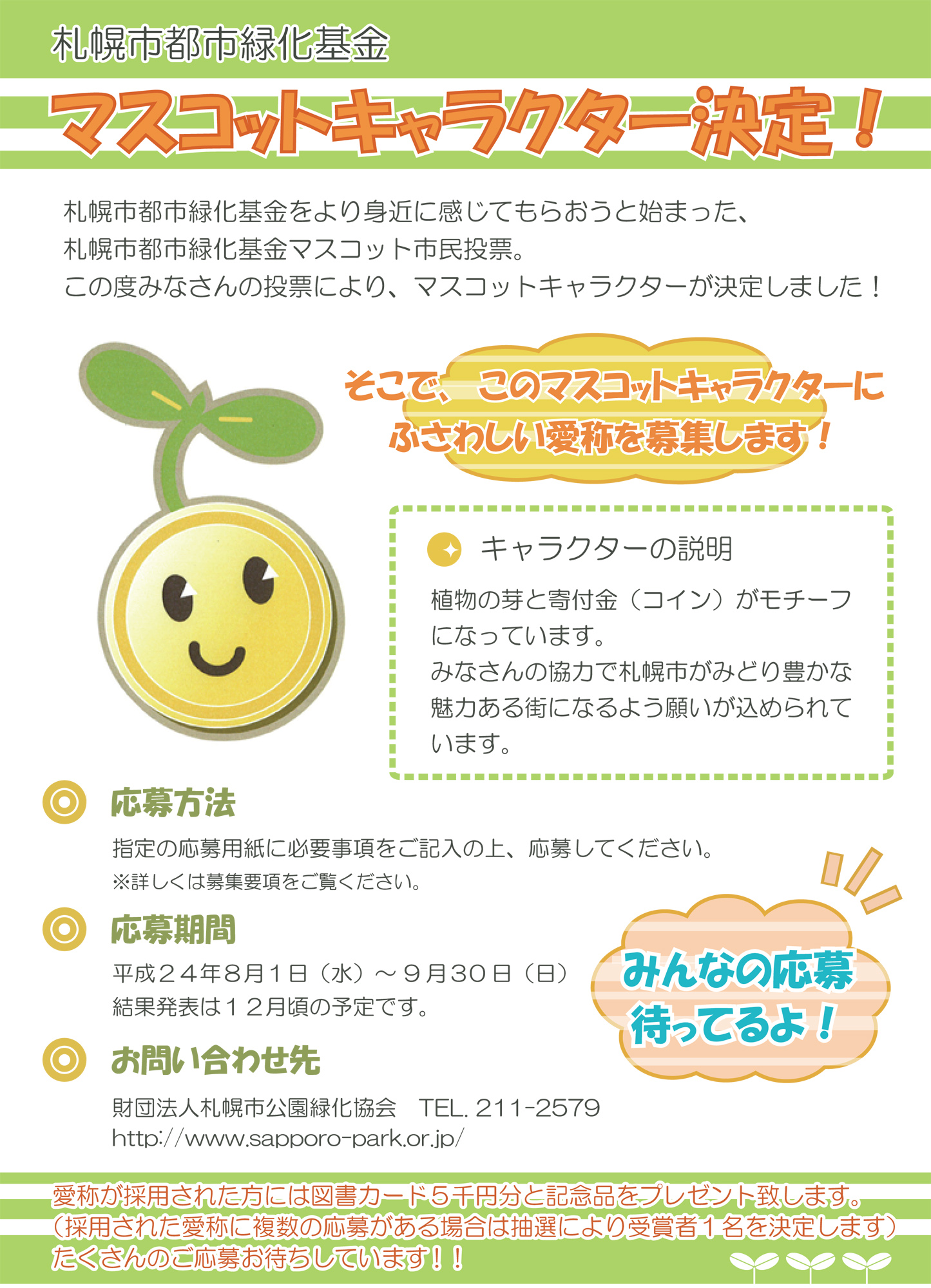 | 札幌市都市緑化基金をより身近に感じてもらおうと始まった、 札幌市都市緑化基金マスコット市民投票。 この度みなさんの投票により、マスコットキャラクターが決定しました! そこで、このマスコットキャラクターにふさわしい愛称を募集します!! ☆ 募 集 期 間 ☆ 募集は終了致しました。たくさんのご応募ありがとうございました! 只今、愛称の選考を行っています。 愛称が決定しましたらホームページにてお知らせ致しますので、 今しばらくお待ちください。 ☆ 応 募 資 格 ☆ 札幌市内に住所もしくは勤務先を有する方、または、市内の学校に在学している方 ☆ 賞および賞品 ☆ 最優秀賞(愛称として採用) 1点 図書カード5千円分、記念品 (最優秀賞の愛称に複数の応募者がある場合は、抽選により受賞者1名を決定します。) ☆ 提 出 方 法 ☆ (1)①持参、②郵送(はがき・封書)、③電子メールのいずれかの方法で提出してください。 (2)指定の応募用紙は、百合が原公園、農試公園、前田森林公園、川下公園、モエレ沼公園など市内14公園で配布します。またはコチラ基金キャラクター愛称募集用紙(PDF)からダウンロードしてください。 ※詳細は基金キャラクター愛称募集要項(PDF)をご覧下さい。 □■□ 個人情報の取り扱いについて □■□ 募集にあたり取得した応募者の個人情報は適切に管理し、この事業以外に使用しません。