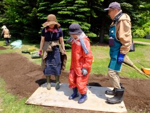 転圧する際には写真のように2~3人で板にのって、ぴょんぴょんと跳ねて固めてもらいました。