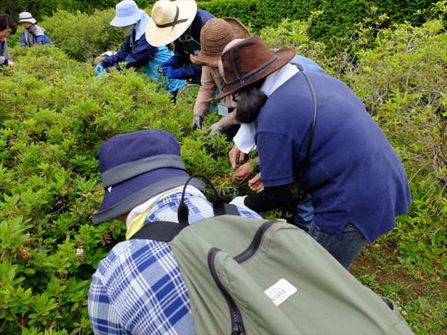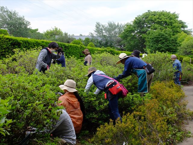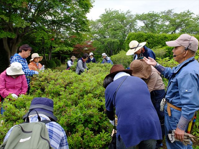 まずは花柄摘み。ツツジの種類によって花柄が違うことも発見。栄養を木に回すため、めしべまで摘み取ることが大事です。ハサミを使わず手で取る方が効率的でした。
