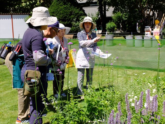 今回は主に、花がら摘みと、姿形を整えるための切り戻しの作業です。いろいろな宿根草や一年草で構成されていて、普段見慣れない植物に受講者のみなさんも興味津々。