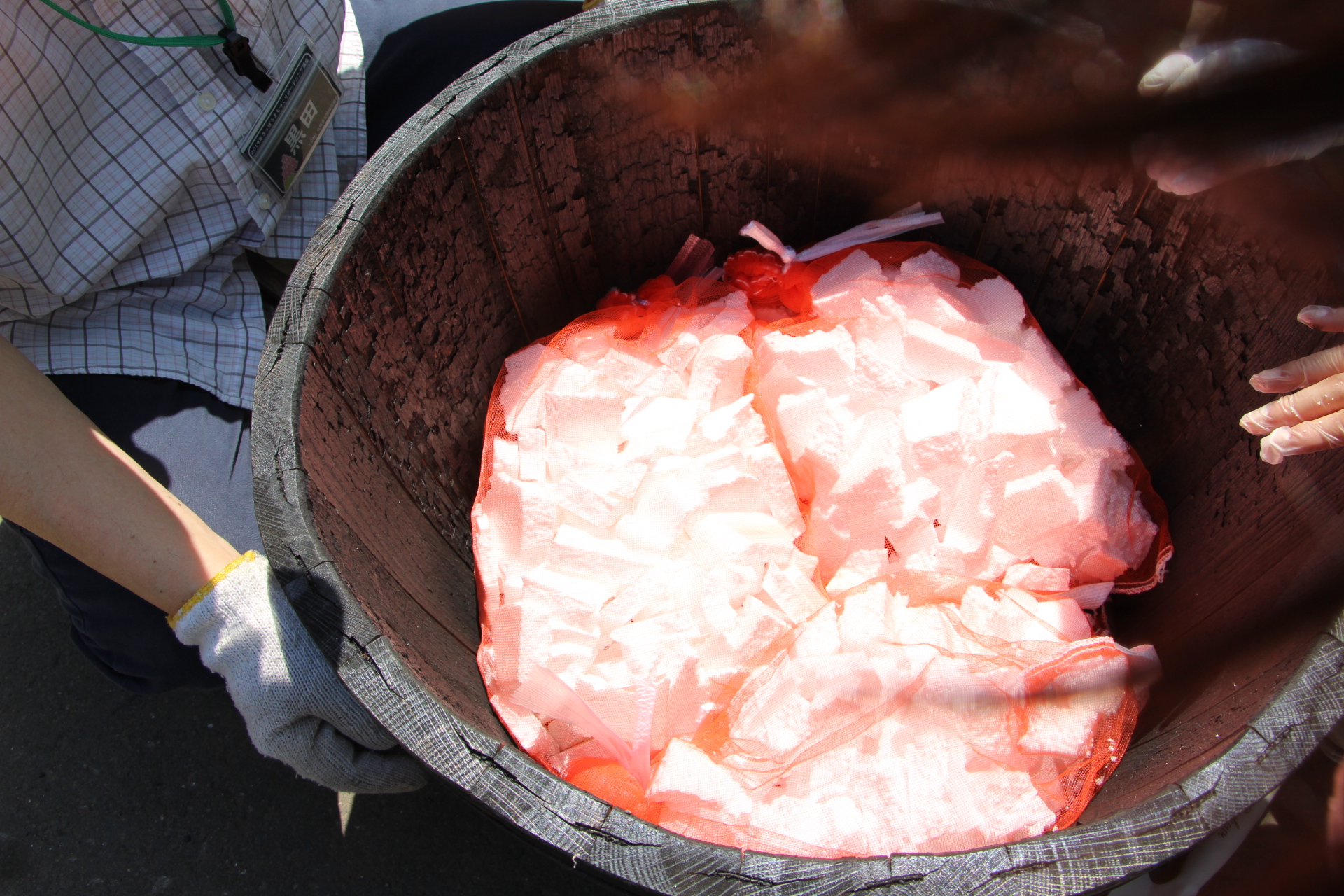 コンテナに土を入れる前に発泡スチロールを底に詰めることで通気層を確保し、軽量化を図れます。