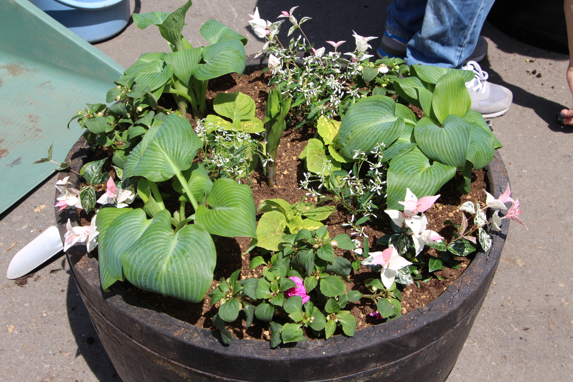 今回のコンテナでいうと、主役はインパチェンス、脇役はギボウシやユーフォルビアです。