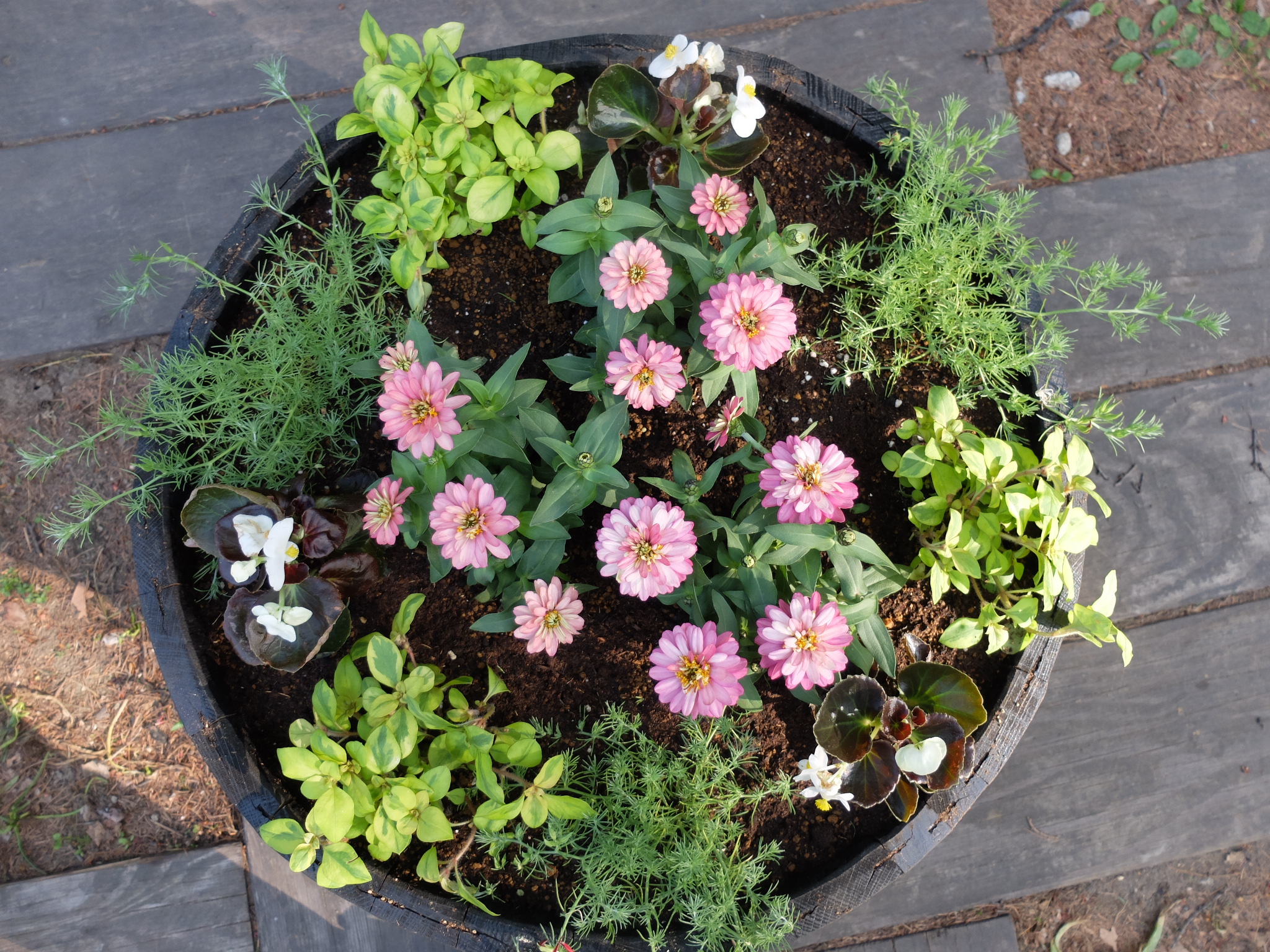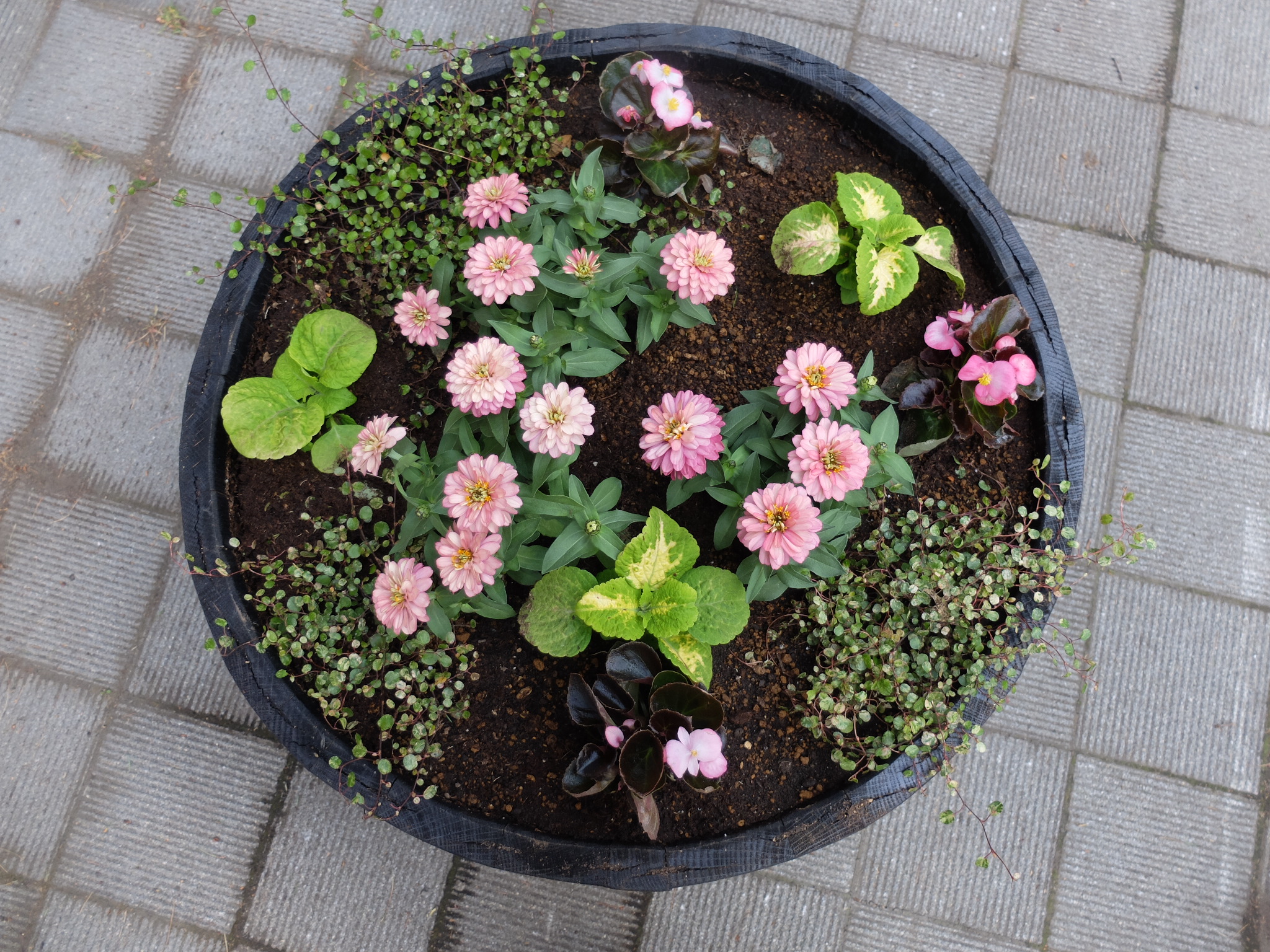 コチラのコンテナでは、濃いピンクから白っぽく色が抜けてしまったジニアの切り戻しをしました。