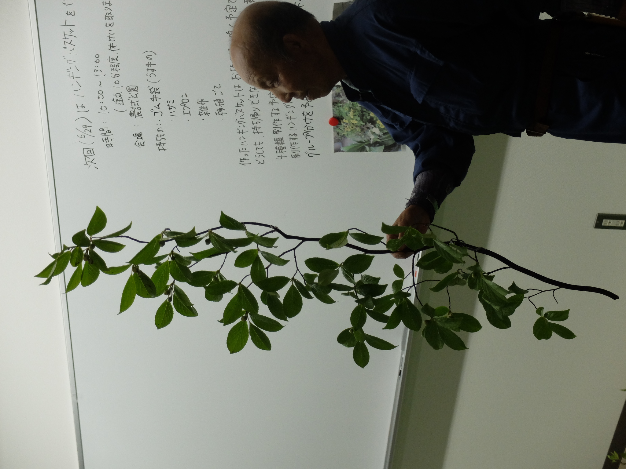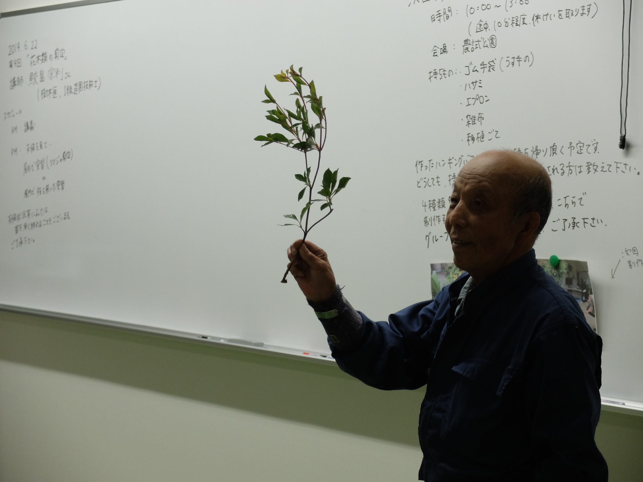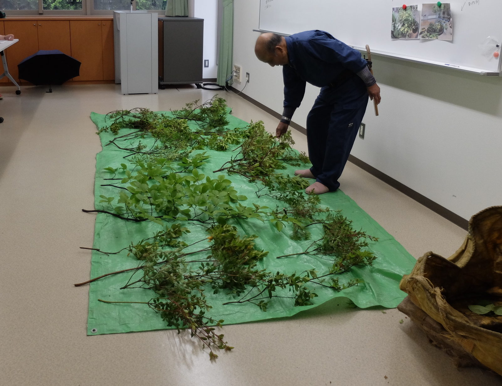 午後は、あいにくの雨だったことから、講義室内で園内から採取した枝を用いて剪定を実践してもらいました。