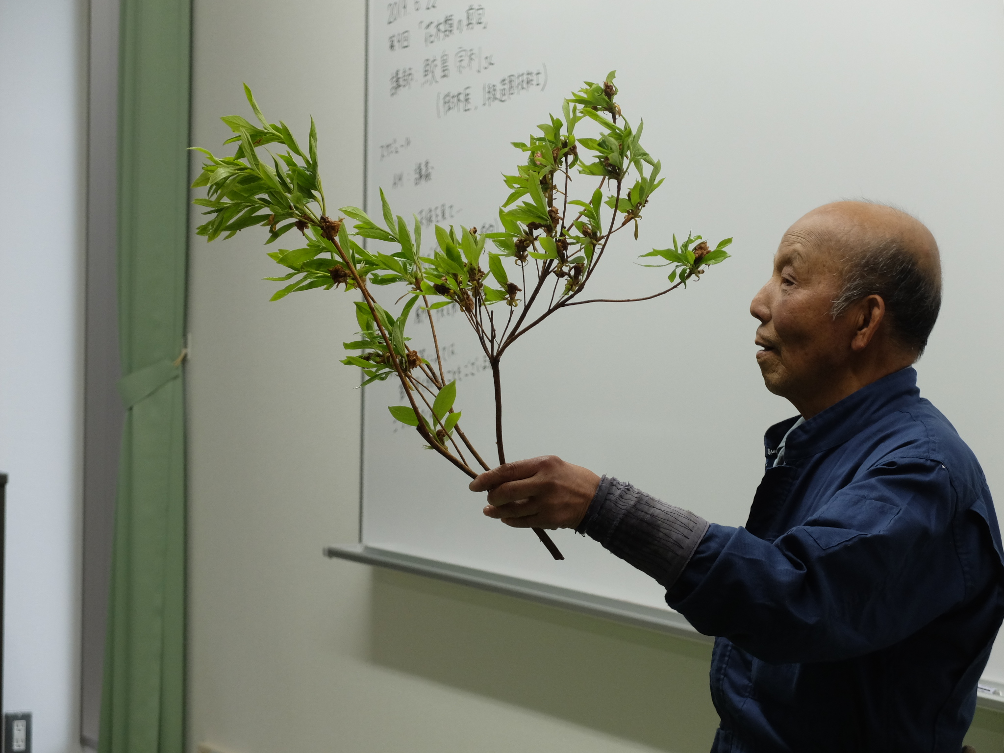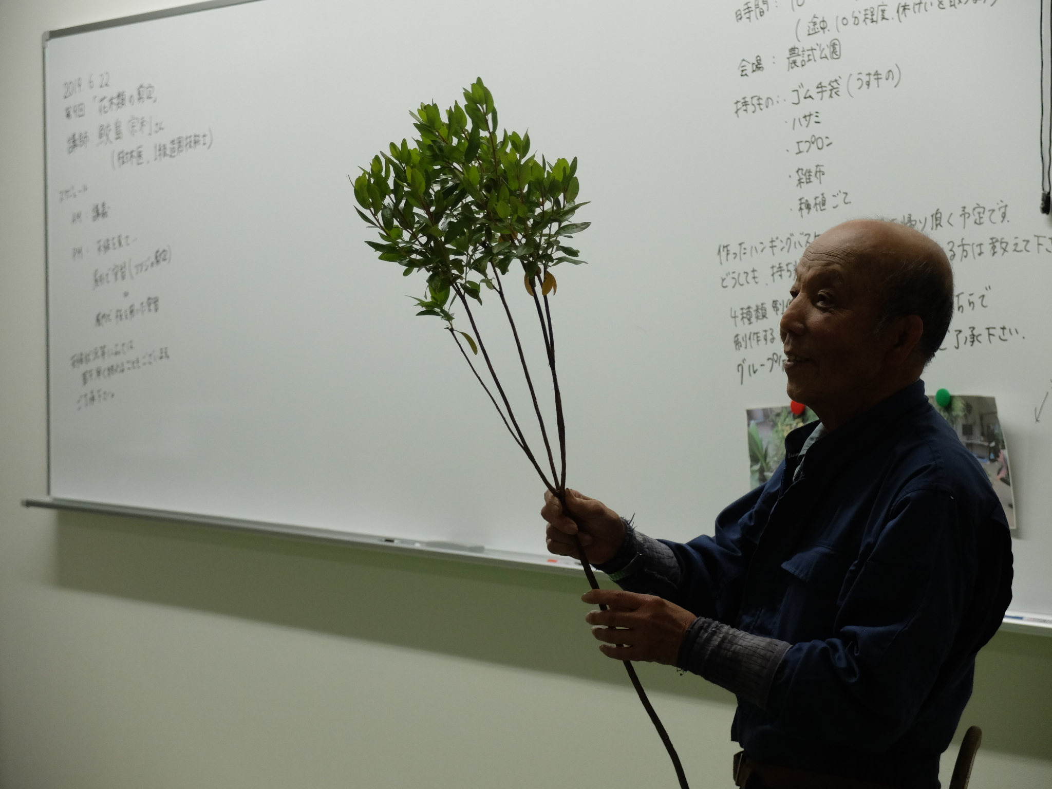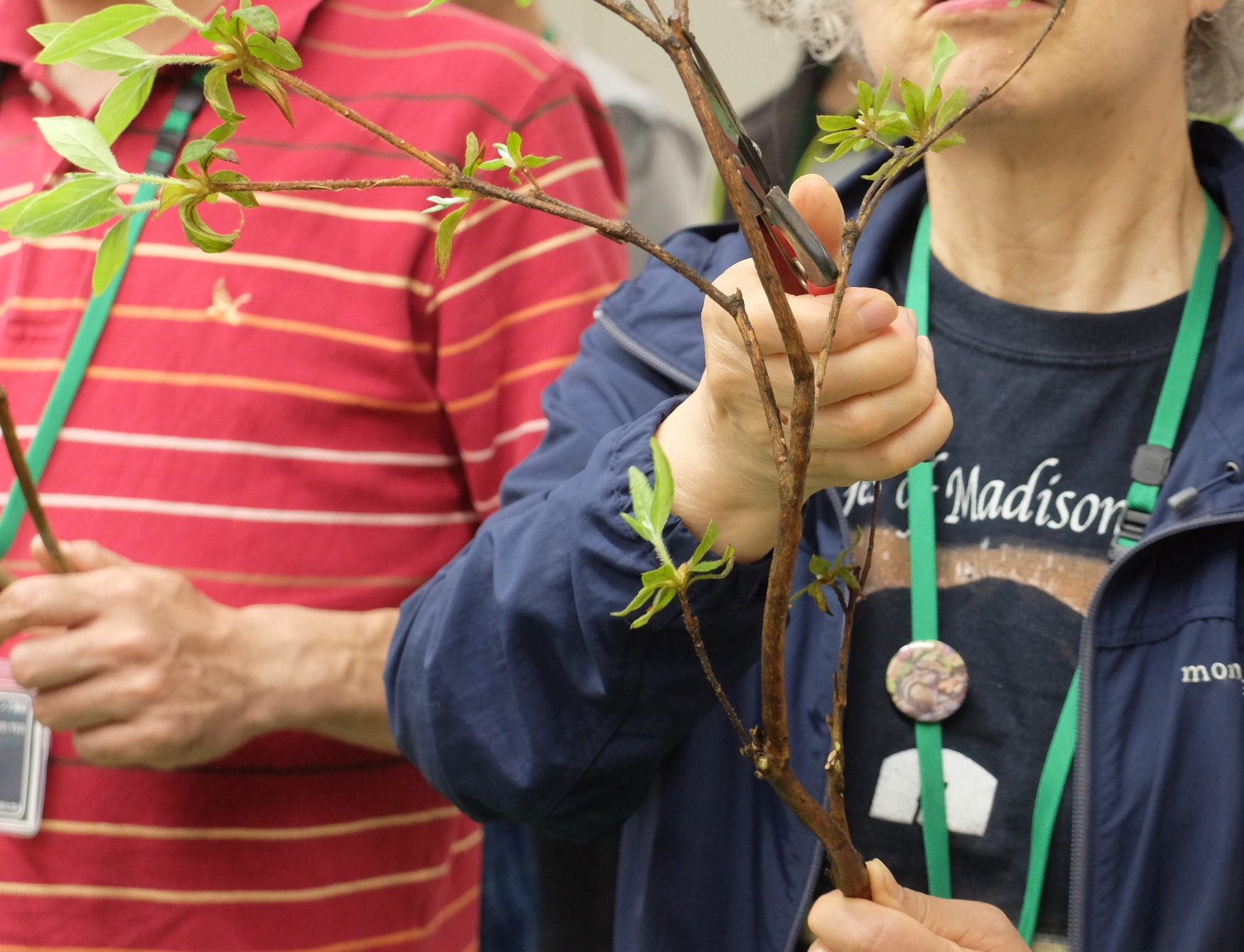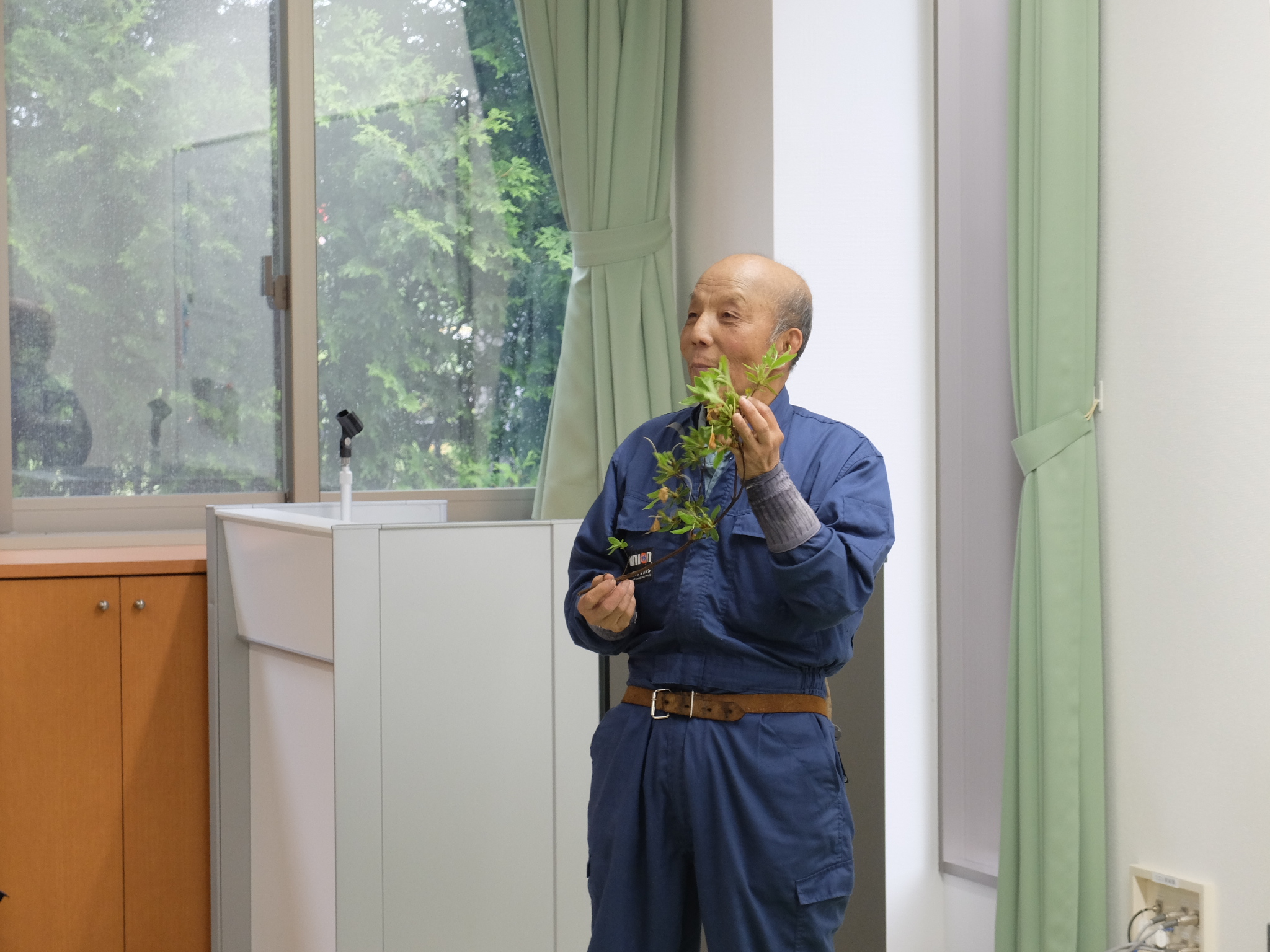午後は、あいにくの雨だったことから、講義室内で園内から採取した枝を用いて剪定を実践してもらいました。