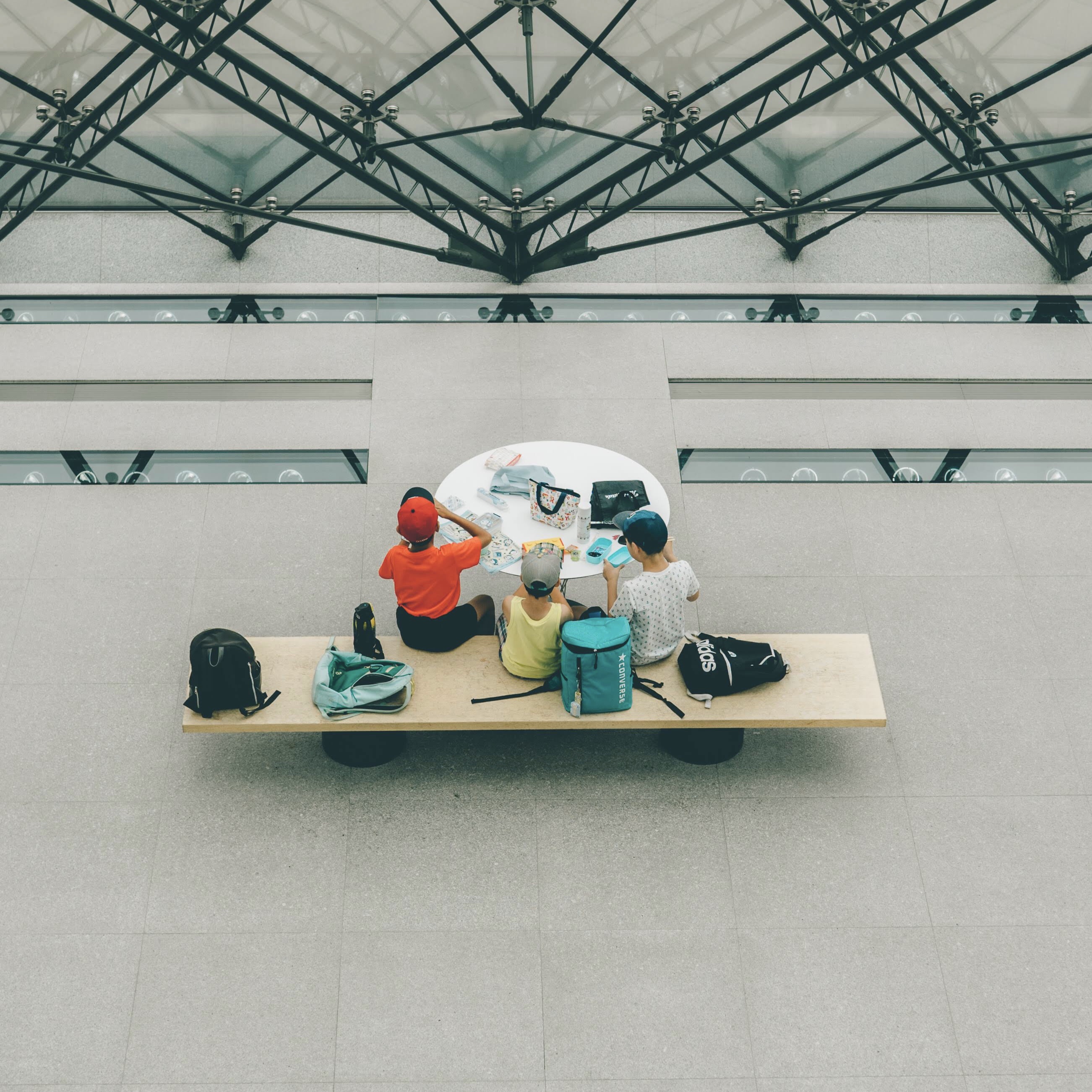 初めて旅中にモエレ沼公園を訪れたときの一枚。建物内でカップルや家族連れがいる中、仲良し3人組の男の子たちが信号機の色と同じように揃ってご飯を食べてるところを撮影しました。憩いの場としても利用されてるところにほっこりしました。