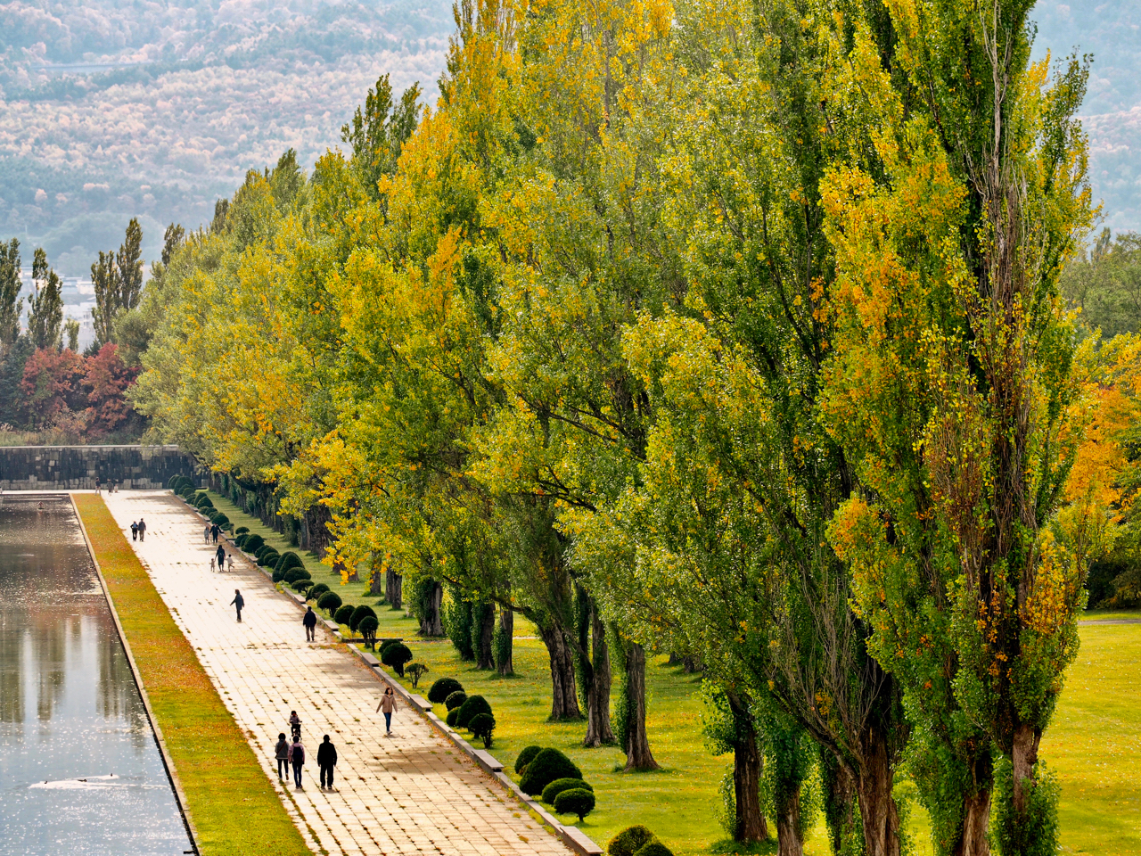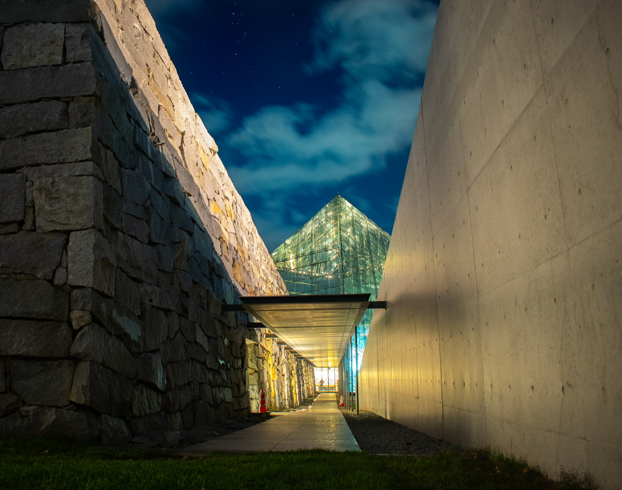 ガラスのピラミッドへまっすぐ伸びる歩道がとても印象的でした