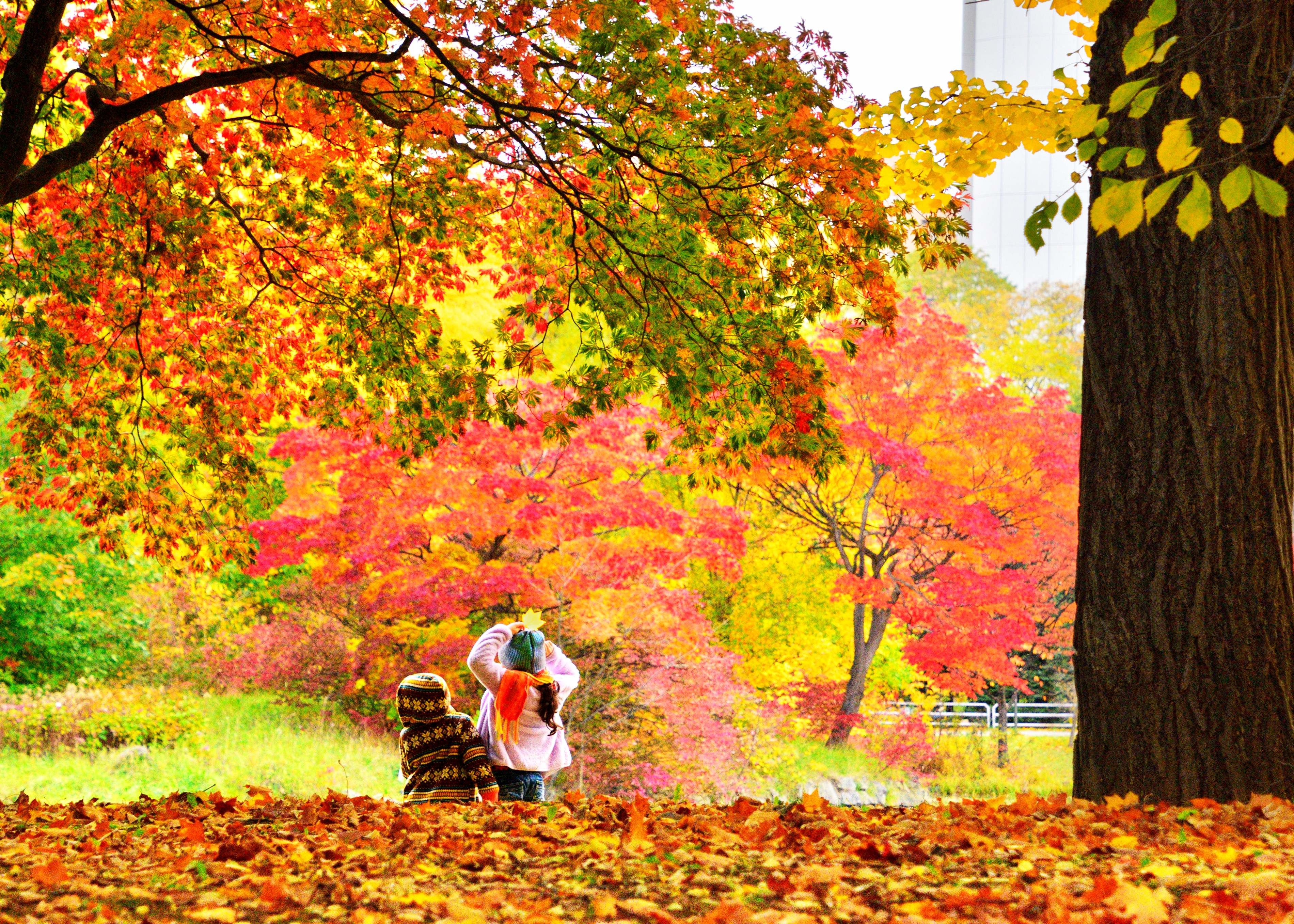 中島公園菖蒲池で見かけた光景。 もみじを頭にポーズをとっている子供達が妖精 の様に愛らしく、公園の美しい景色の中でキラリ 光っていました。