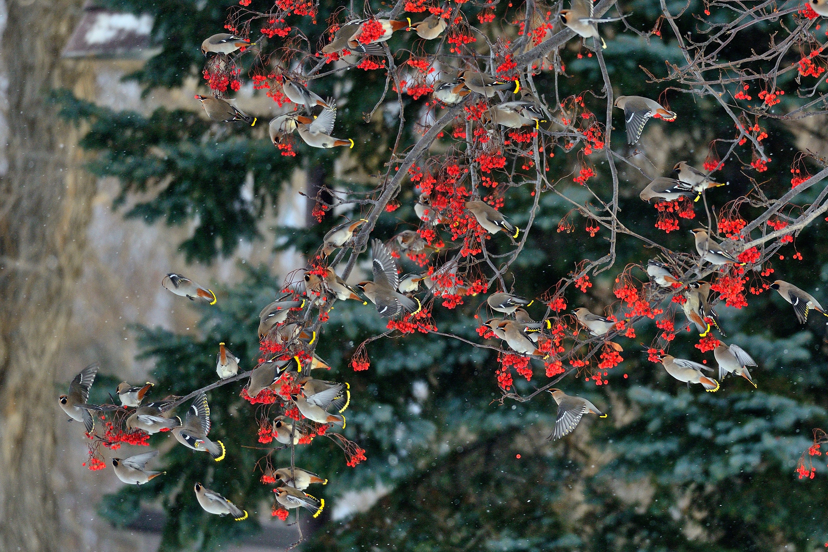 天敵のハイタカが来る前に必死で実をついばむキレンジャク、この後すぐにハイタカが来てどこかに飛んで行った。