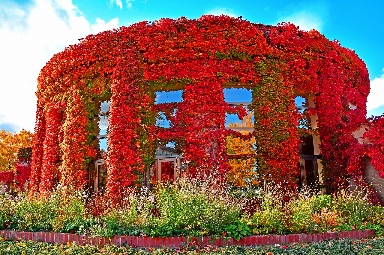 農試公園ツインキャップの外壁のツタが真っ赤に色づきとても綺麗でした。イチョウの黄葉も窓ガラスに映り込みました。