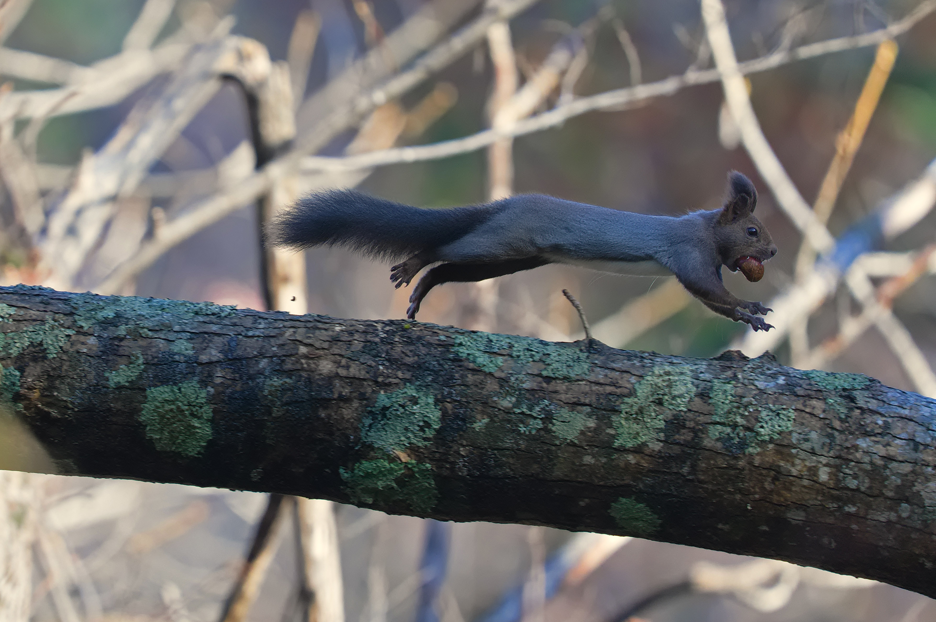 西岡公園で見つけたエゾリスです。地面で何かを見つけたら素早く木に登って倒れた幹の上を走っていきましたが、何とかその姿を写真に捉えることができました。見つけた餌はどうも栗のようです。