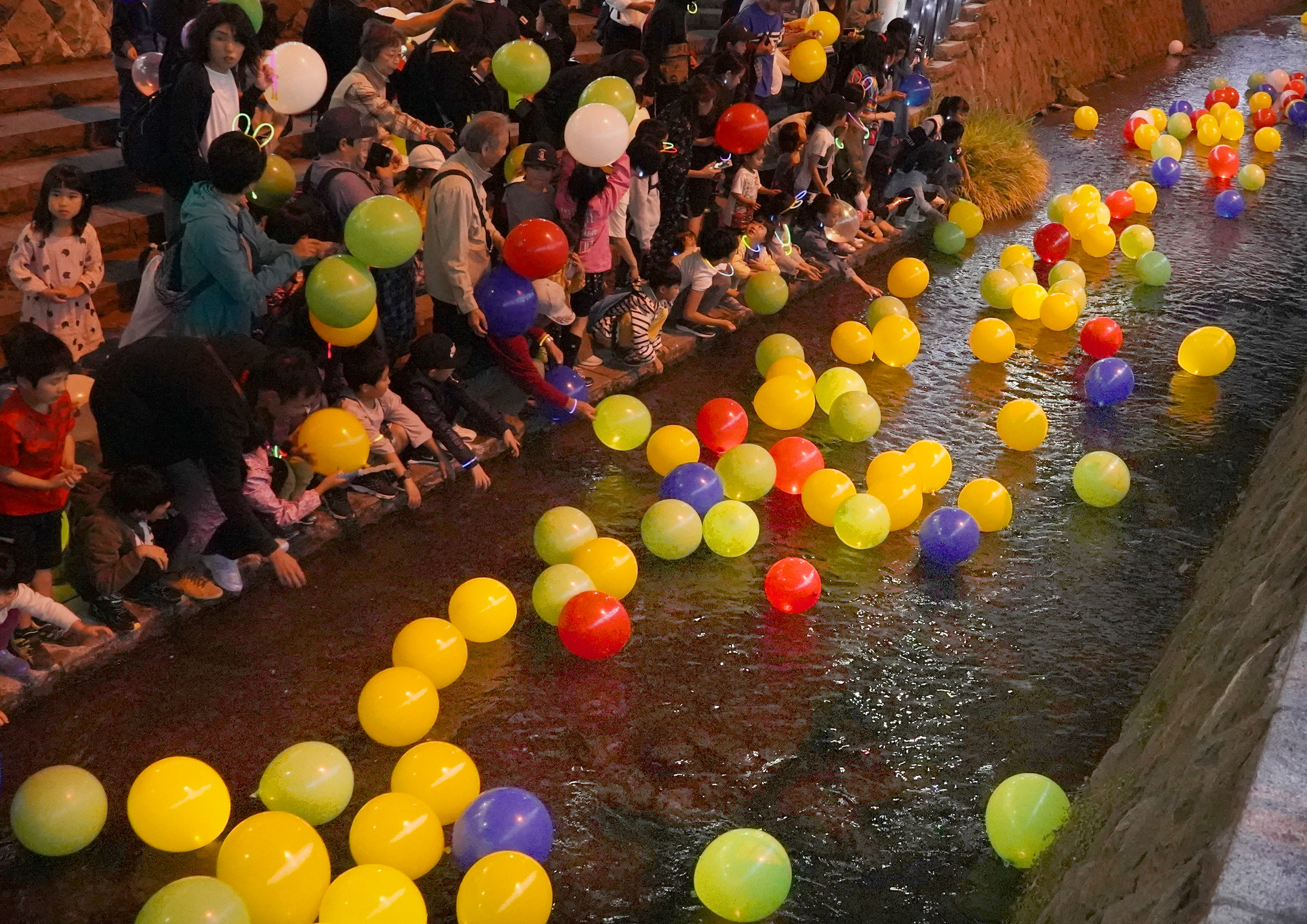 創成川を流れるLED風船に大勢の人が集まりました。子供たちも大はしゃぎでした。
