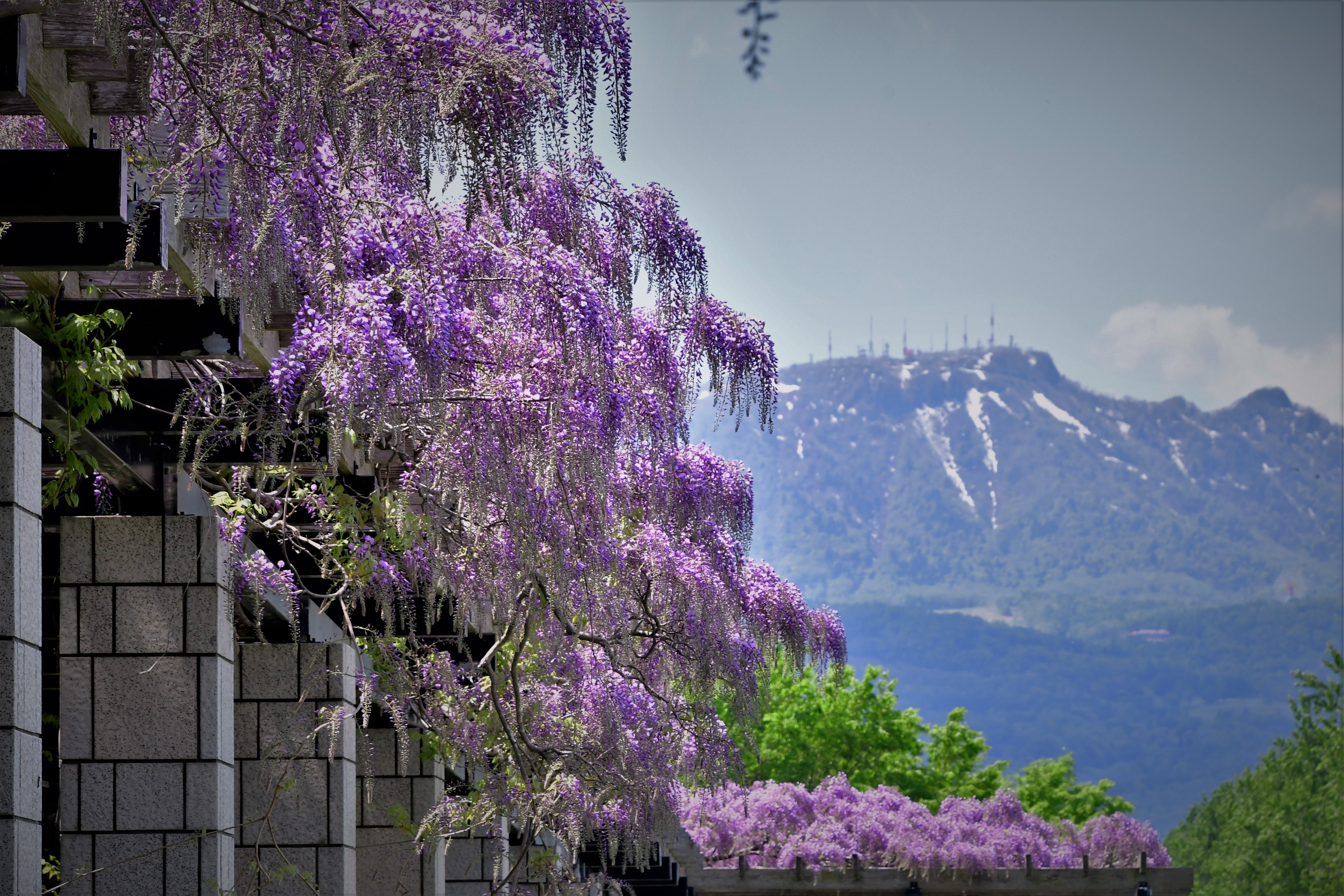 残雪の手稲と藤の花」