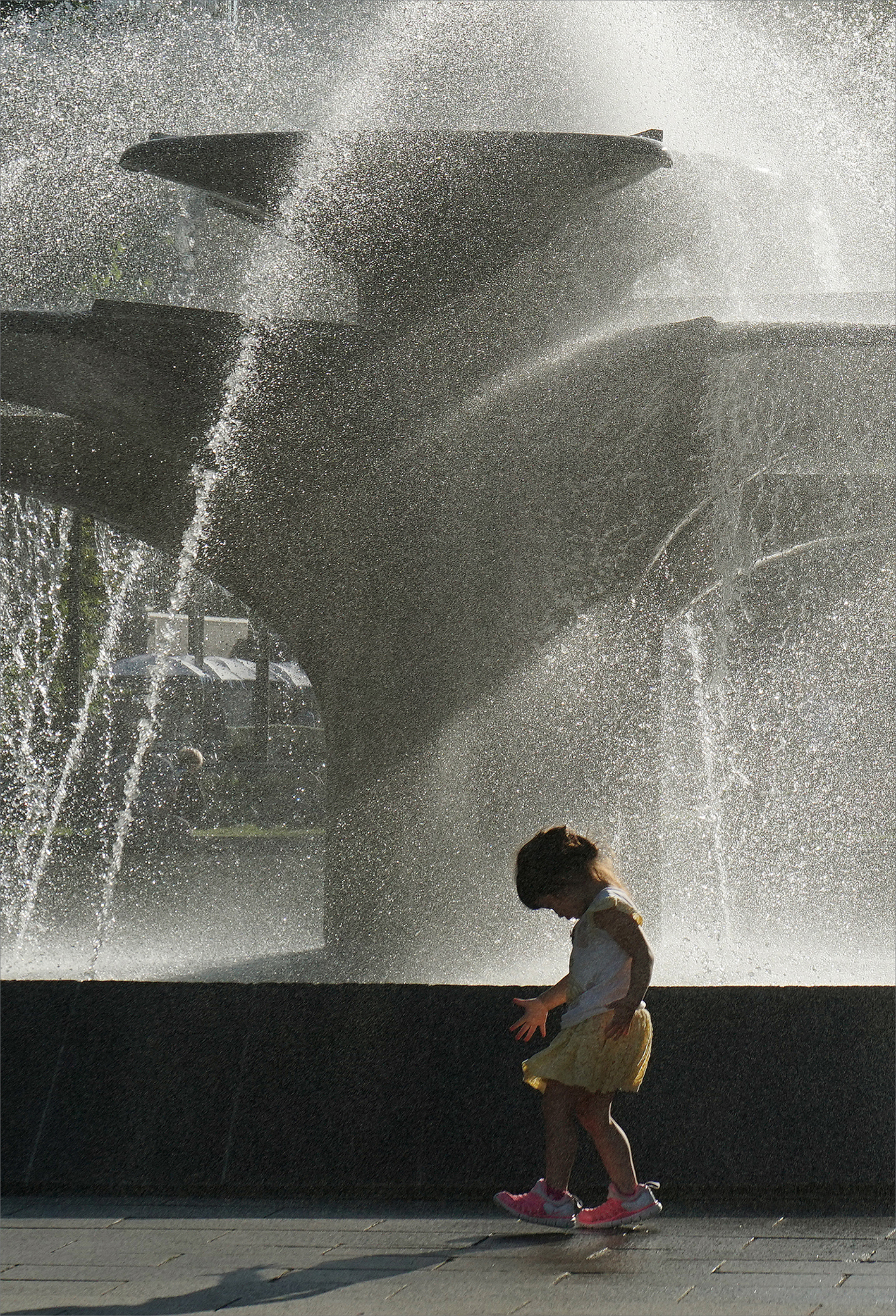 西陽に輝く噴水前にまるでダンスを踊っているような小さな女子。ピンク靴が嬉しくてはしゃいでいるようで可愛かったです。