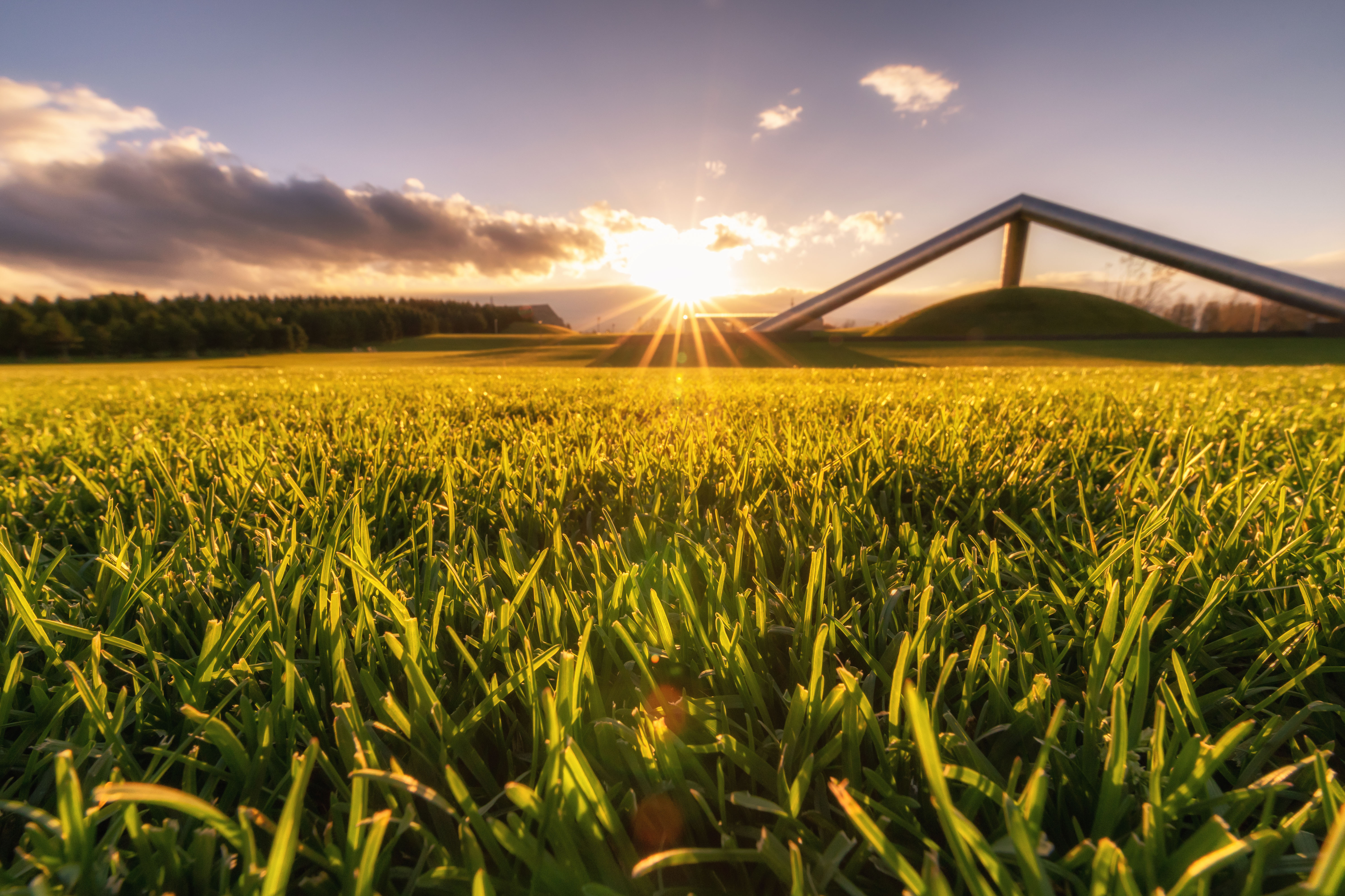 テトラマウンドを遠目に撮ろうと歩いてみる、夕日を浴びて黄金に輝く芝が印象的でした。