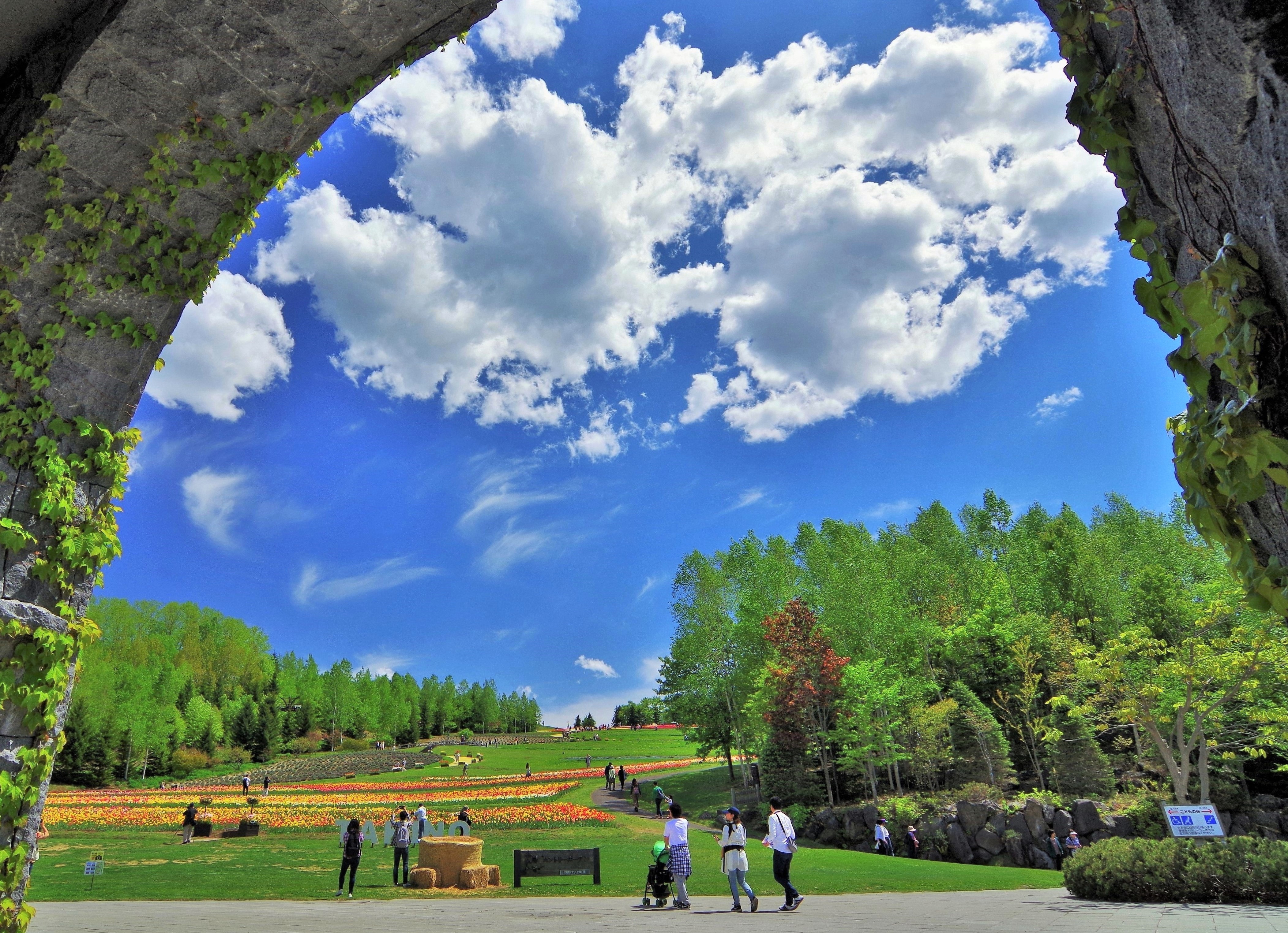 青い空と白い雲。暖かい陽射しが降り注ぎ、新緑やチューリップなど春の花が咲き、絵画のように撮ってみたいと感じました。