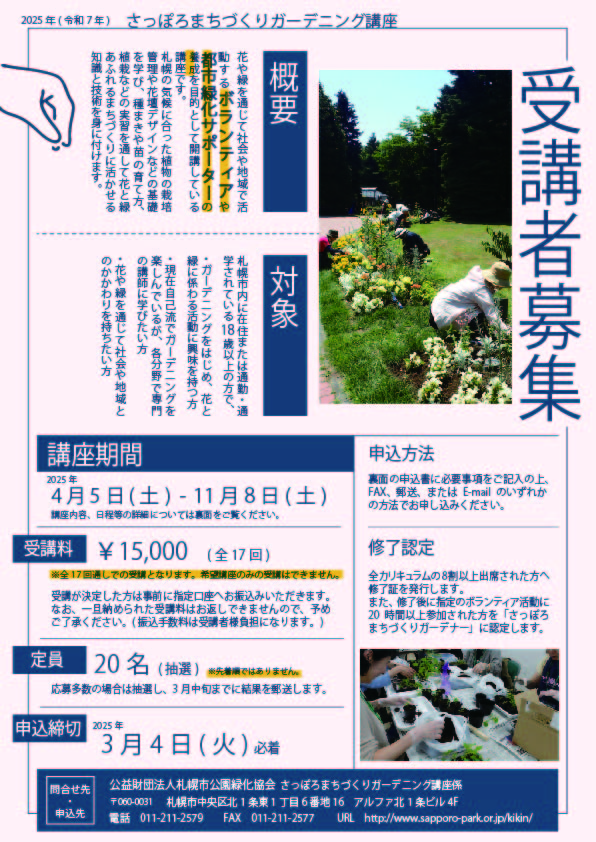 内容:札幌市内の公園を会場に講義と実習を通してガーデニングの基礎を学ぶ全17回の講座です。4月5日から11月8日までの土曜日、月1回から3回程度開催します。