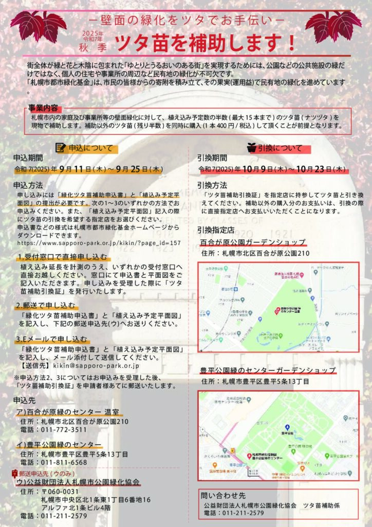 公益財団法人札幌市公園緑化協会 ツタ苗補助係 電話(011)211-2579