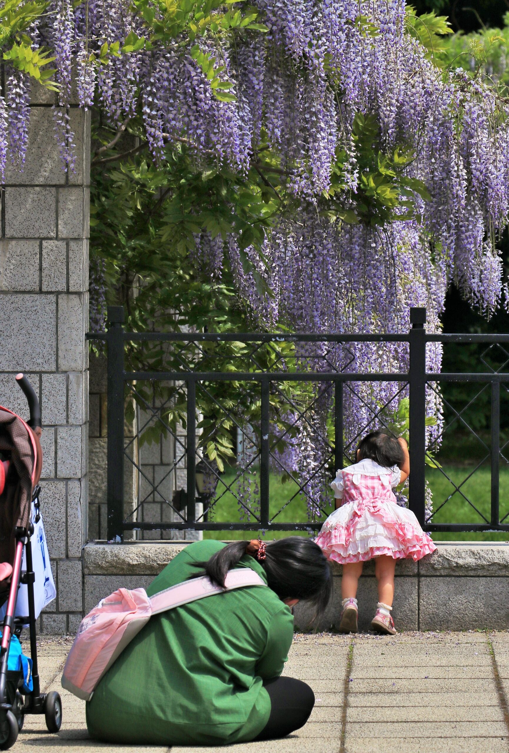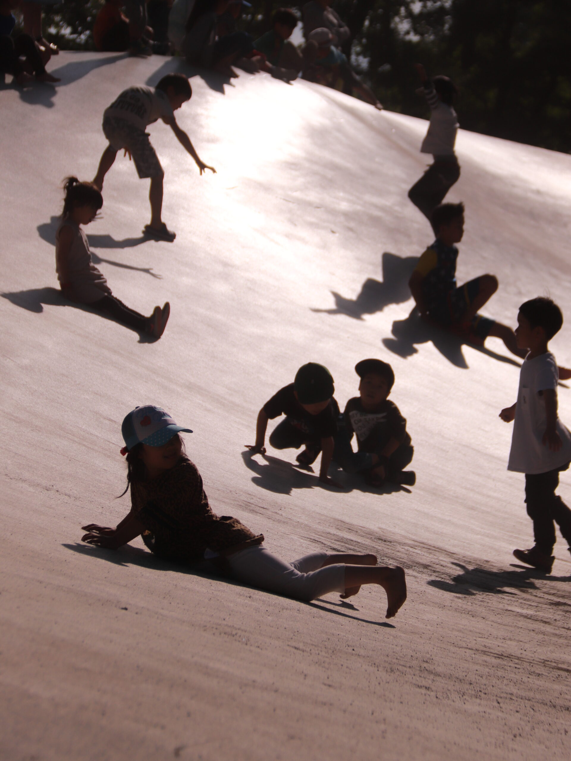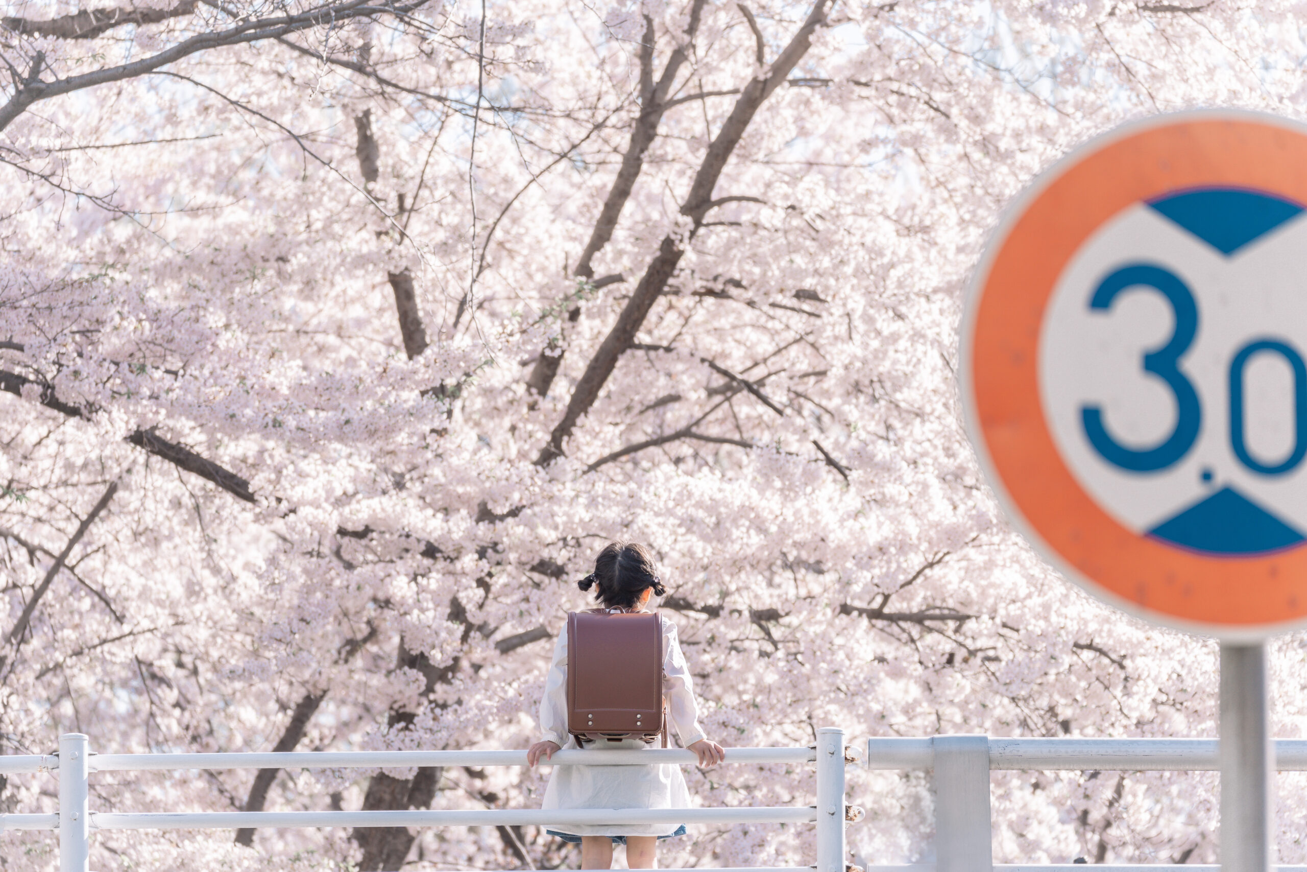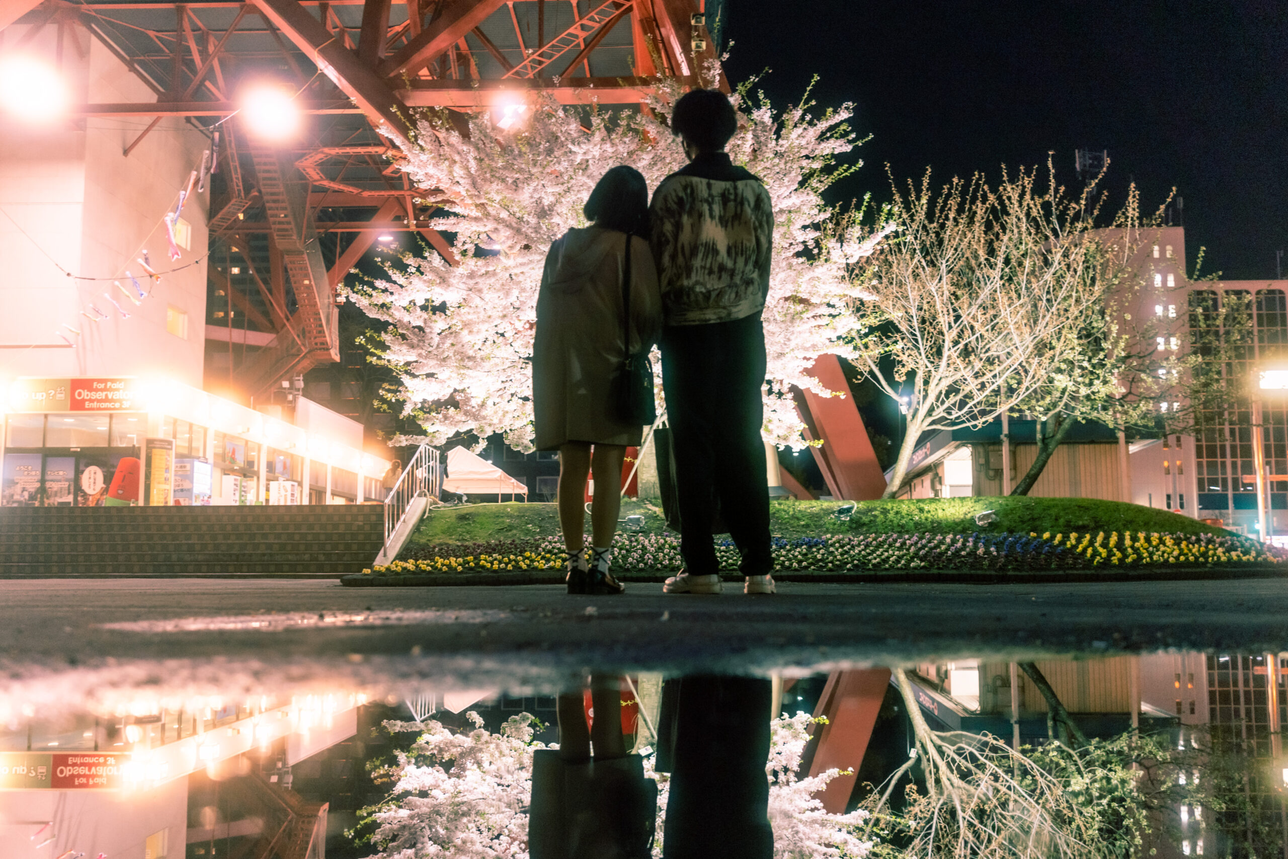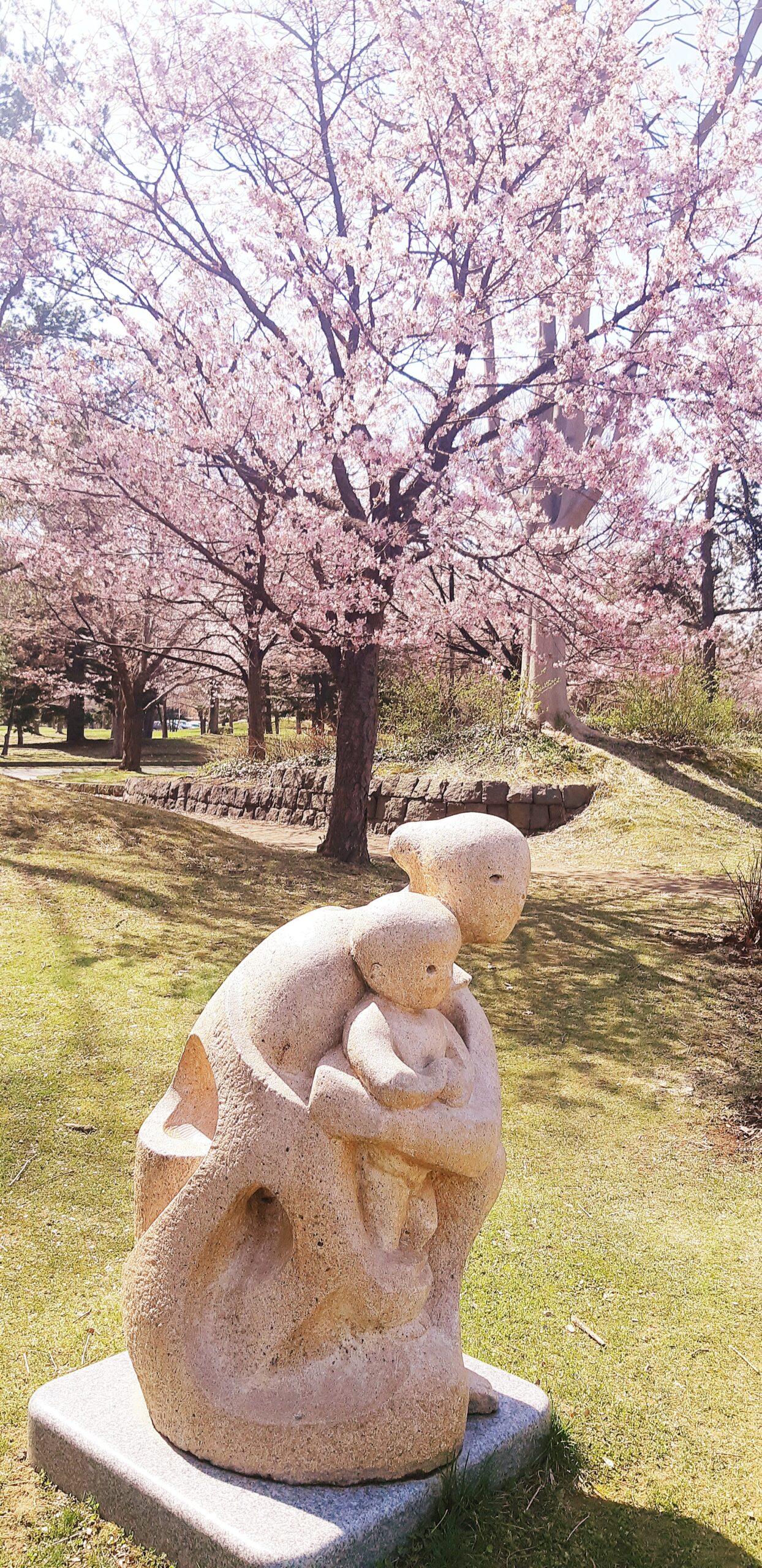 桜咲き誇る春の自然と幾何学形状を模した遊具や建物の芸術融合。自然と人工物の調和がそこにはありました。