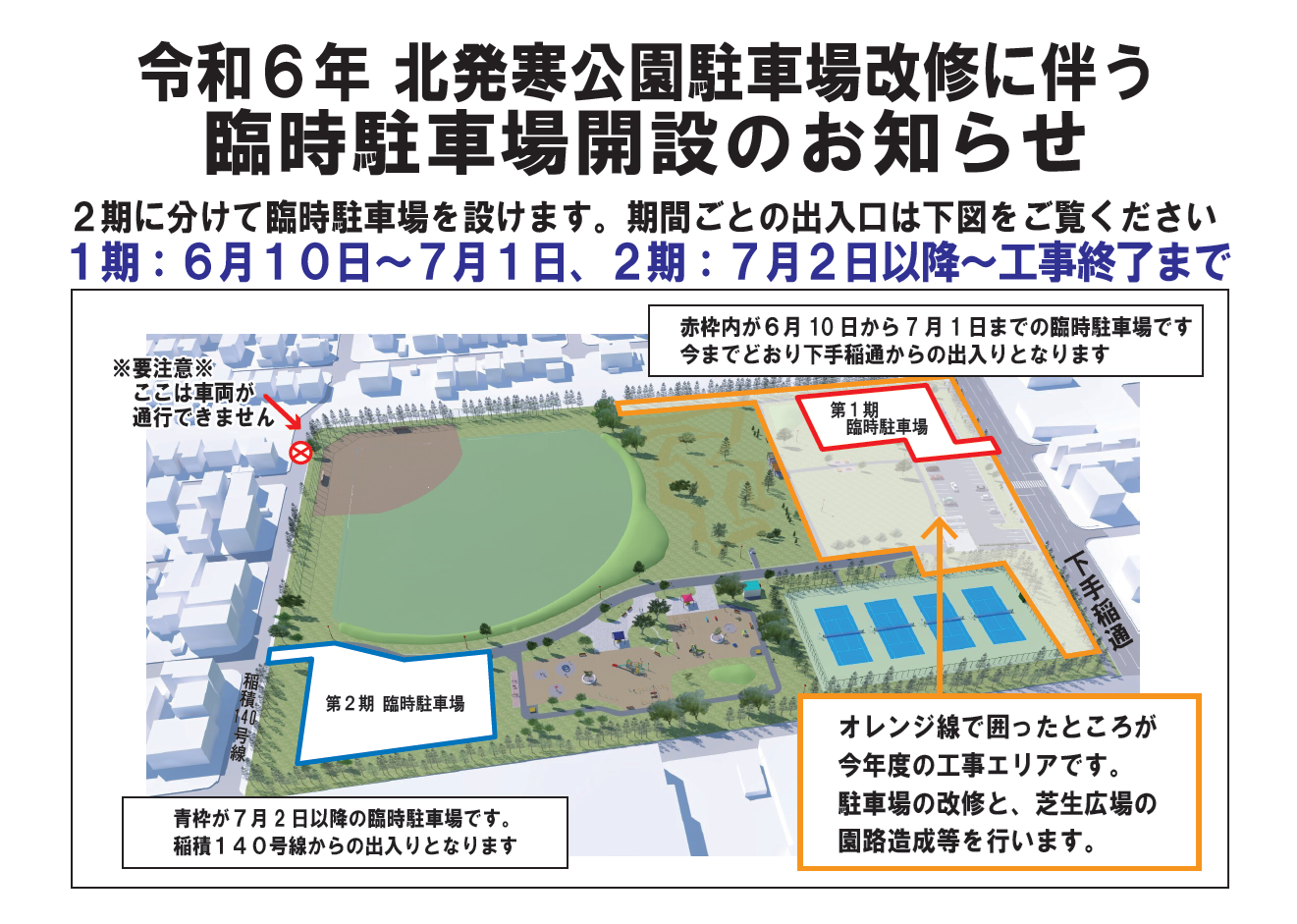 臨時駐車場は工事期間中、1期・2期と分けての開設となり、場所の変更があります。