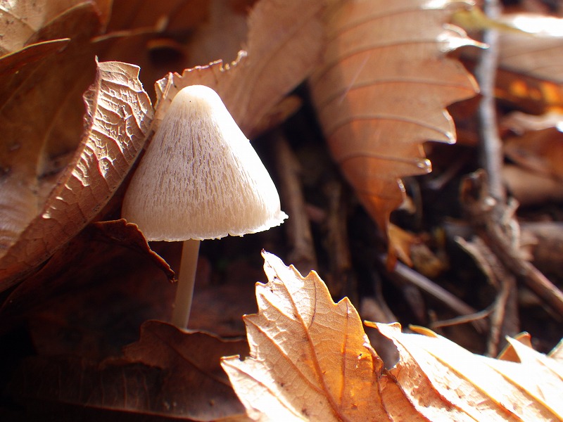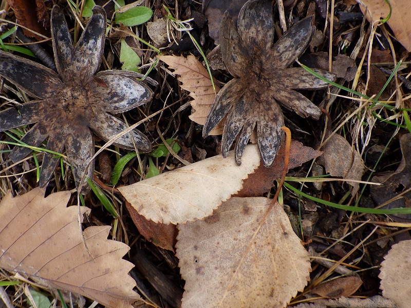 園路脇の落ち葉を見ていると、ツチグリの星形の外皮をたくさん見つけました。他にも落ち葉の下から顔を出すキノコも。キノコ類はもう少し楽しめるかな。