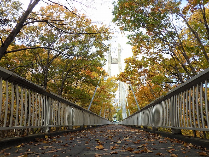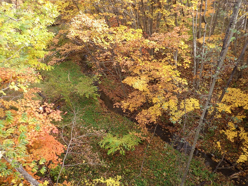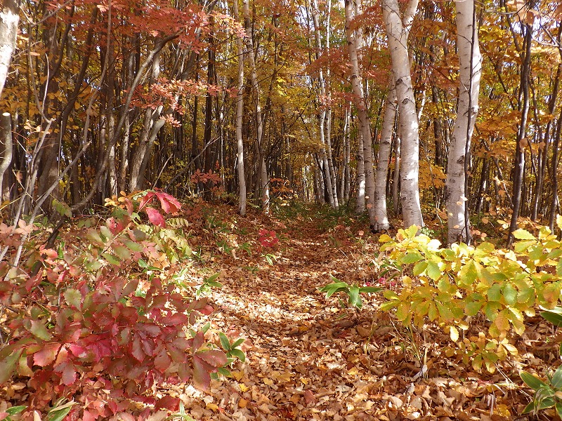 園内の林はミズナラやコナラ、イタヤカエデが優占し、黄色からオレンジ色、茶色へと変化する葉っぱがほとんどです。そこにハウチワカエデの紅葉と、シラカンバの白い幹が加わって、あたたかい秋の景色が広がります。